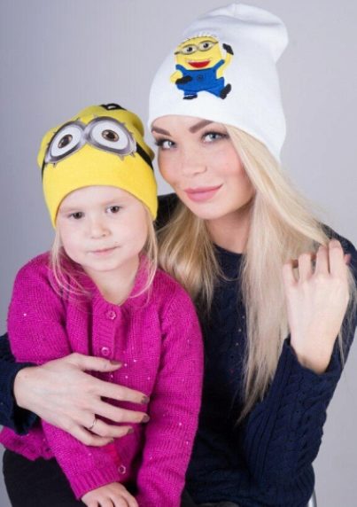The woman and her daughter are fans of cheerful characters, as well as lovers to wear paired clothes. In this case, the theme on the synthetic caps is similar, but the images of the yellow pets of the children are different in the following way: the mother has a whole minion on a light background, like in a cartoon, while the girl has only her expressive eyes on a yellow background. Such a tandem will not go unnoticed at a joint walk through the park.