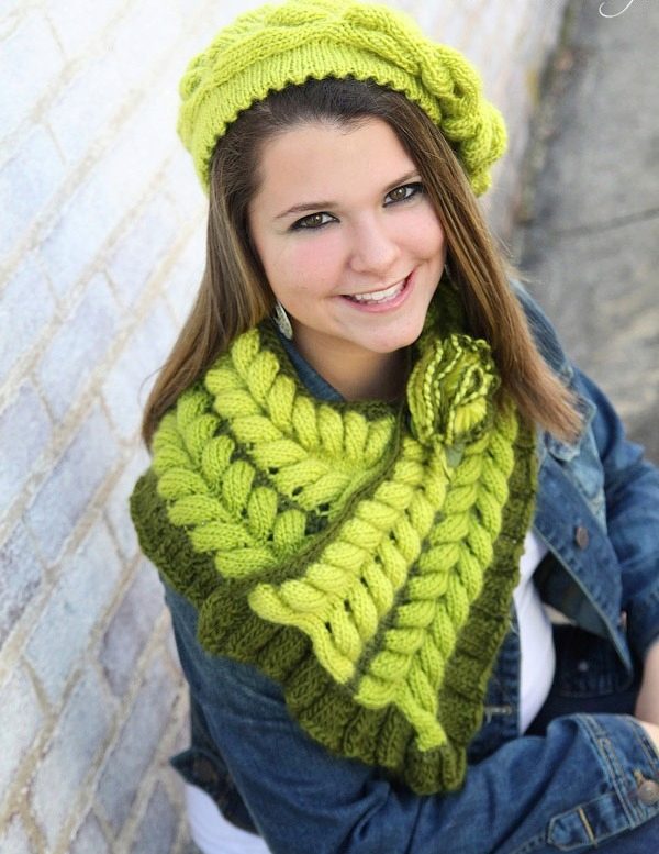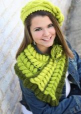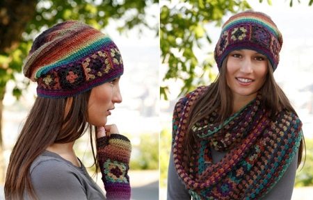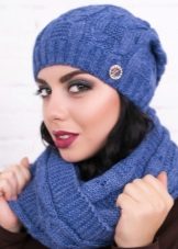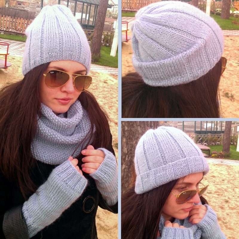 The fashionable beanie cap can be worn in various variations - without a lapel, leaving a sticking top, with a single lapel and with a fold at the back of the head. The ensemble of a hat, mitts and snoat of the same color looks great.