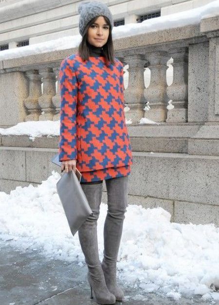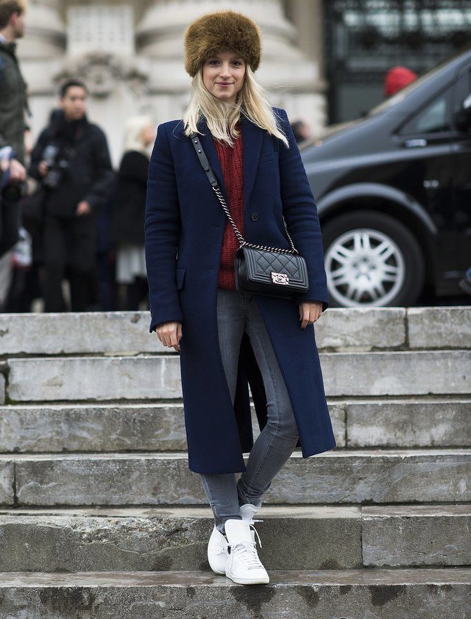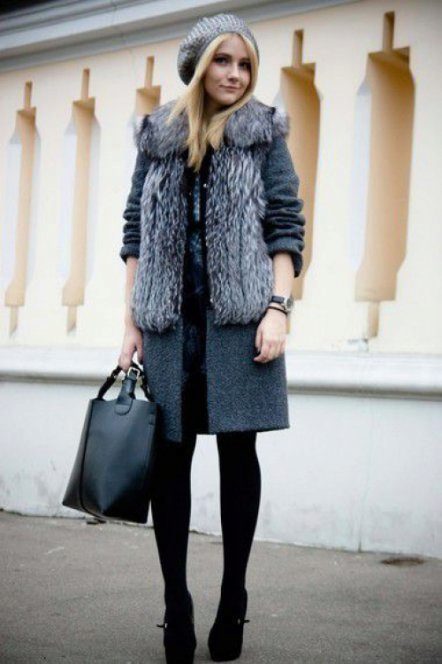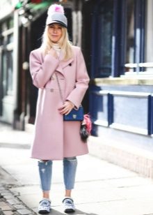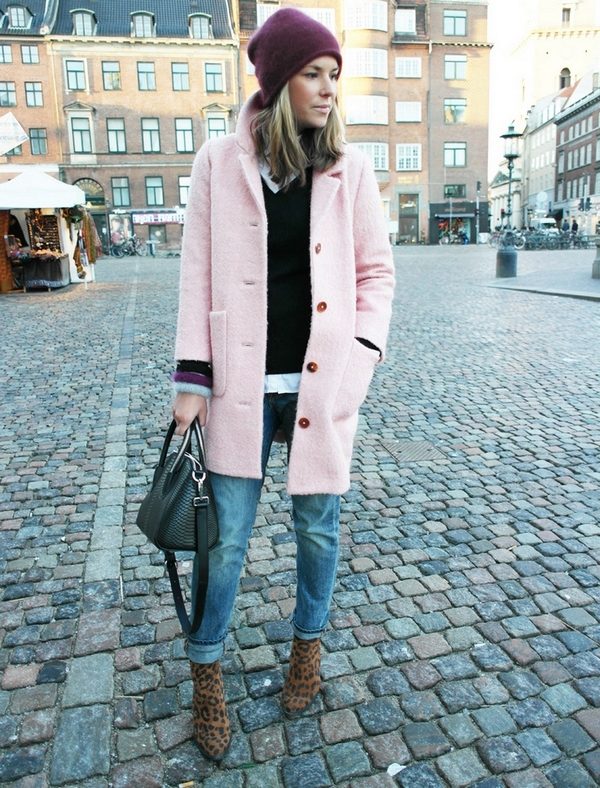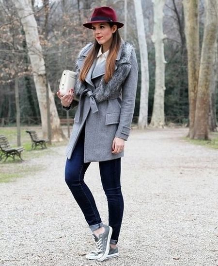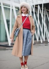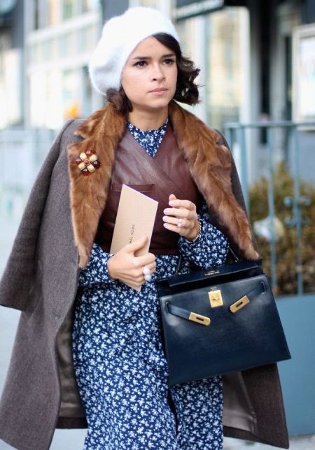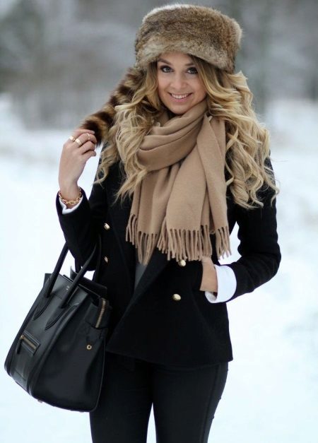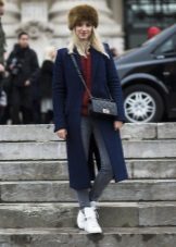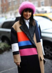 A strict coat will be decorated with a stylish fur hat, even better if the hat is supplemented with a fur collar or a boa made of the same fur. With a classic style coat, you can safely wear a bright and original hat with an interesting and unusual finish, in this case the emphasis will be placed on the headdress.