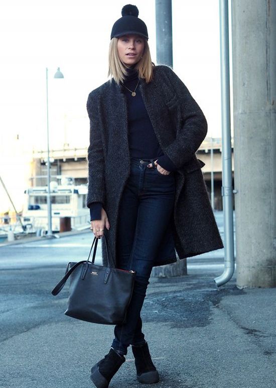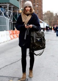 With a coat - oversize will look great hat - stocking (sock). The advantages of this model are that due to the elongated shape, the cap can be stacked in different ways, while inventing new images. Naughty hats with pompoms and fur hats with earflaps with ears tied back perfectly complement the oversized style.