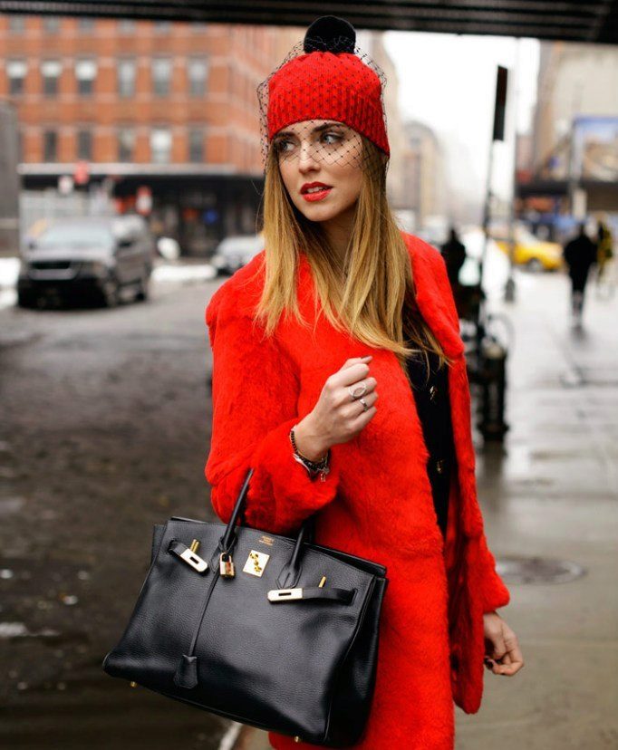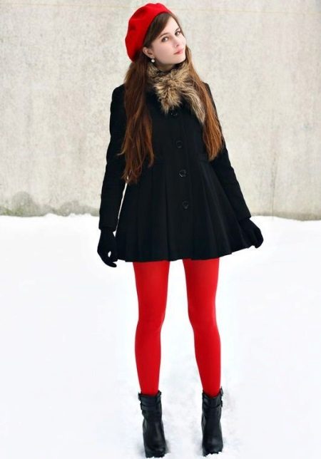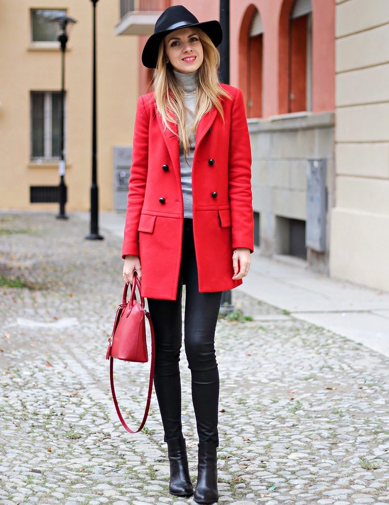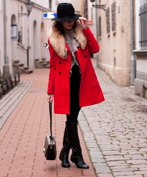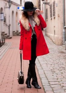 Red coat with a black hat or beret, as if made for each other. This combination will create a gorgeous image for any woman, the main thing is to correctly match them in form and texture. The red coat itself is bright and expressive, so you should not overload it with a bright and too decorative headdress. White, milky and all shades of gray from light gray to the color of wet asphalt will suit the red color.