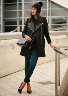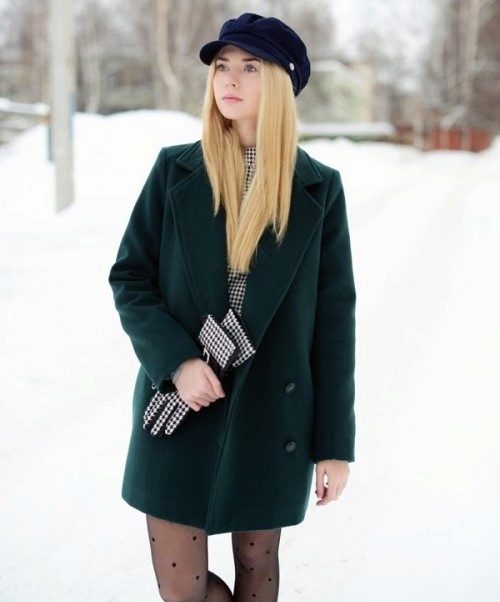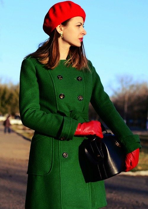 With a green coat Red, light sand color and various shades of brown are perfectly combined. There is a lot of controversy about the combination of red and green in clothes, but the combination of a dark green coat with a red beret, burgundy or garnet beret looks good and extraordinary. In the photo, a green drape double-breasted coat beautifully harmonizes with a bright red beret, leather gloves of the same tone as a beret complement the image.