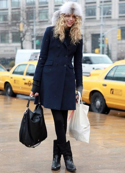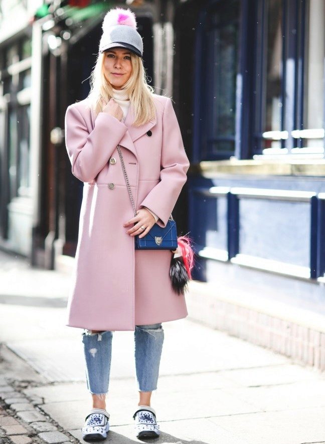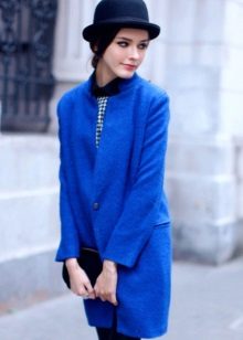 To blue coat different shades of beige, gold and brown, gray and silver will do. A bright blue coat looks great with a dark blue or black cap. With a dark blue coat will look noble milky and white. Pale blue, delicate coral and different shades of pink will give the image of romance.