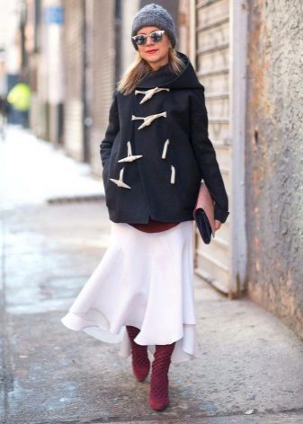A coat with a hood is the ideal of practicality. One of the advantages of such a coat is that the cap can not be worn at all, because in most cases the hood can replace it. If all the same to choose a cap to the coat with a hood, then it is better to consider the most simple knitted models.
