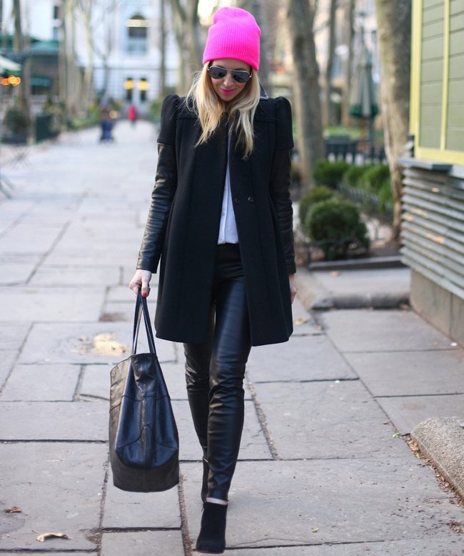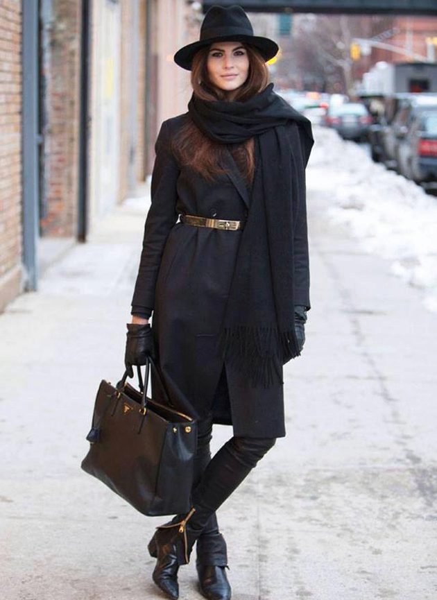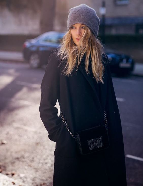 The black color itself is strict and it is desirable to dilute it with a bright color, unusual design and interesting texture. Black hat with a black coat can be safely worn long-haired and fair-skinned blondes or girls with bright red long hair.