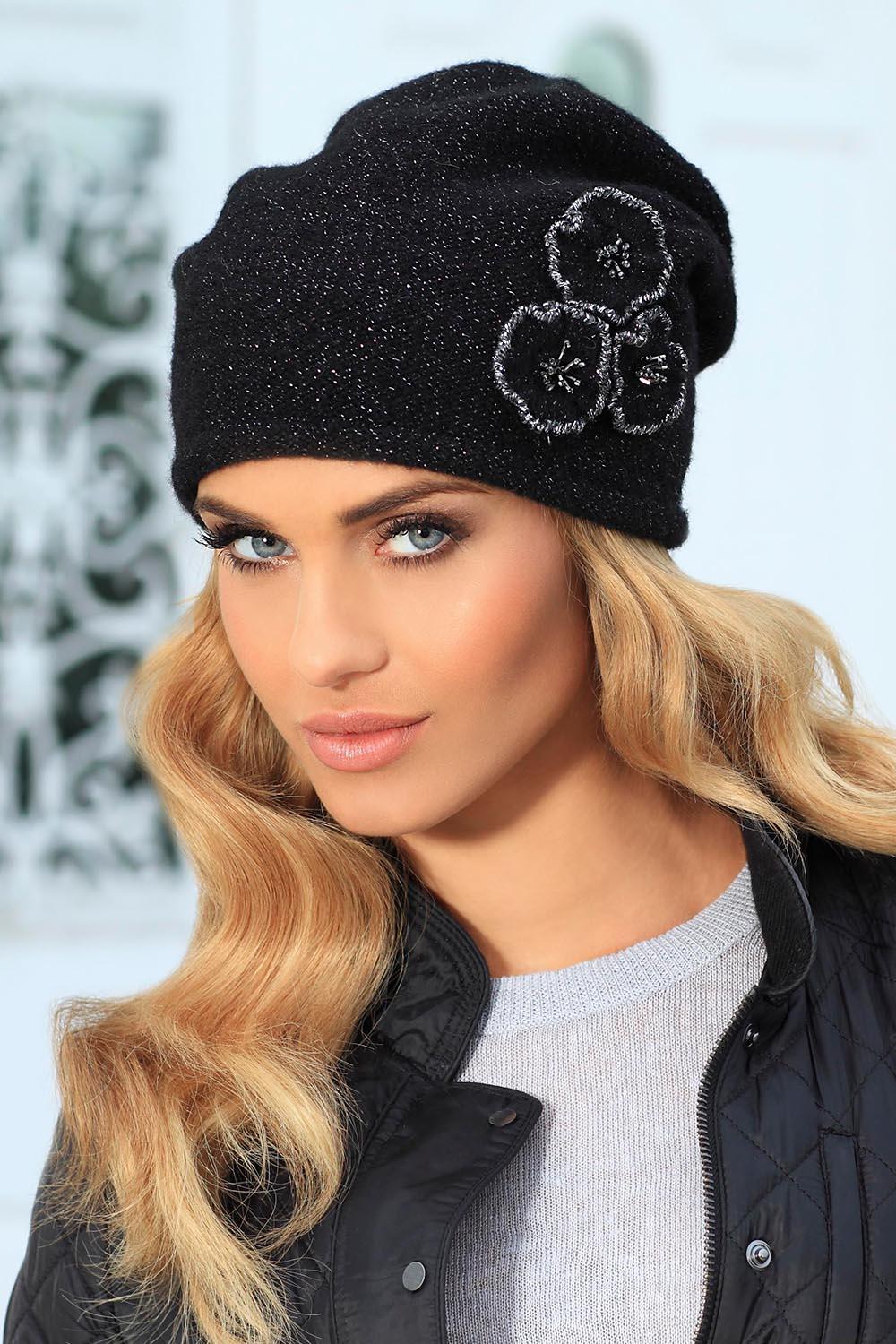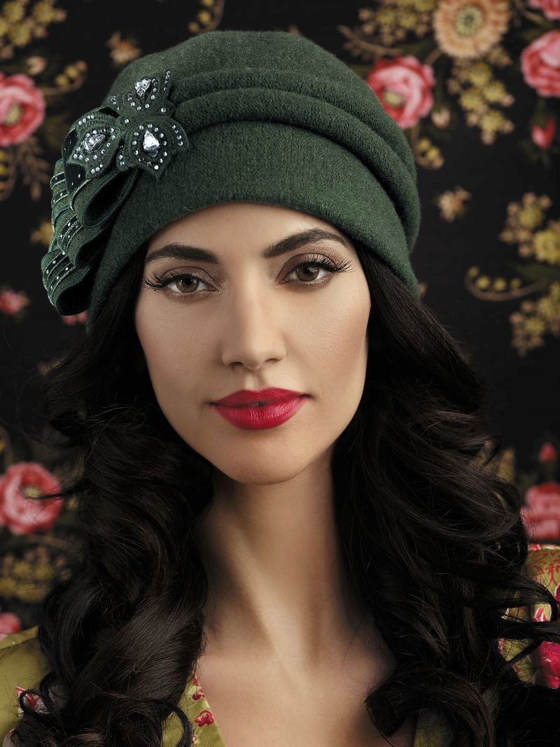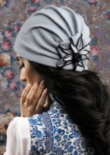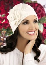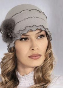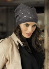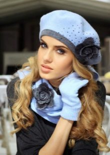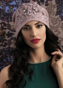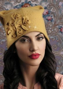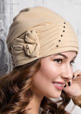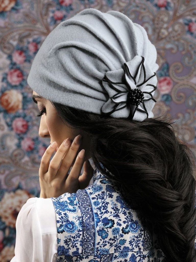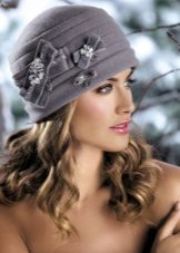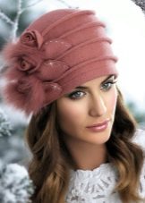 A cashmere hat with small fields, decorated with flowers from the same material and shiny rhinestones will be a worthy addition to a beautiful coat.