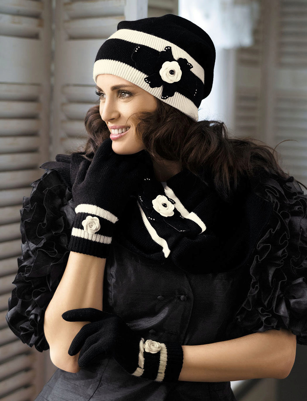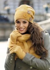 To create a holistic, harmonious set, suitable for a coat or fur coat, gKamea tin caps are complemented by scarves, mittens or mitts, aged in the same stylistic and color scheme.