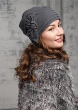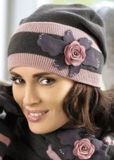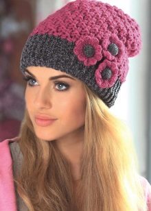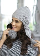 - Elwira. A neat knitted hat with a double tail, decorated with three elegant flowers of a contrasting color.