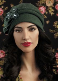Unusual option - a felt from a felted wool. As a decor, curly folds and complex draping are used, giving the cap extra volume. Beads are used as jewelry for this model.