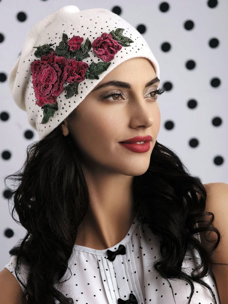 - Margherita. An elegant beret, decorated with a wide border and large floral appliqué made in a color contrasting to a beret.
