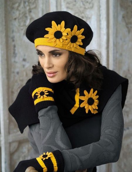 Beautiful black beret decorated with large bright yellow flowers. Scarf and gloves to match the headdress help to create an incredibly stylish and spectacular set.
