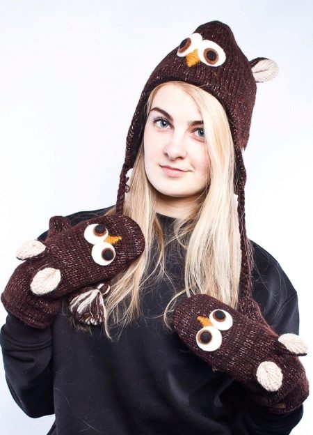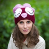 Animal muzzles. One of the most popular options, which is suitable for both children and adults. And it can be muzzles, like real animals (cat, dog, squirrel, bear, hare, fox, hippopotamus, frog), and fictional (unicorn, dragon). The muzzle itself can be in the same plane with a cap, that is, painted or embroidered, and it can also have three-dimensional, relief details, for example, a nose, a beak, paws, teeth, etc. Such a hat will look especially impressive in a set with a stylized scarf or mittens in the same spirit.