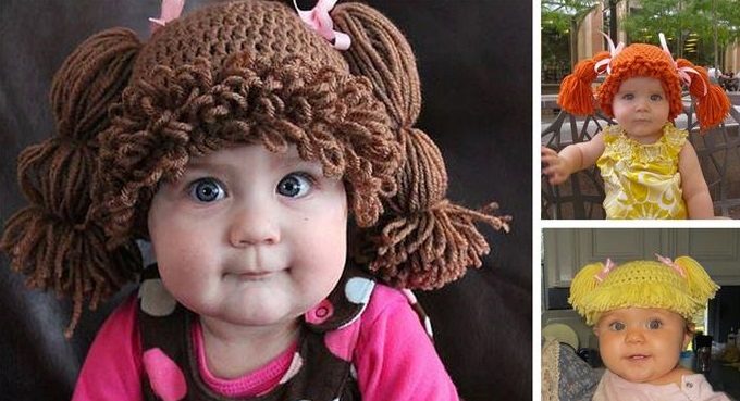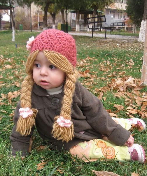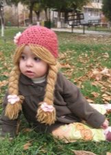 Caps with braids - one of the most popular options for cool models for children. Especially for the little ones. The baby in a hat with two magnificent tails or plump braids on the sides looks incredibly sweet and charming. Another variation on the theme of hair is a hat with a shock of lush hair, decorated with a bow. Such models are stylized as heroes of the animated series “Barbariki”.