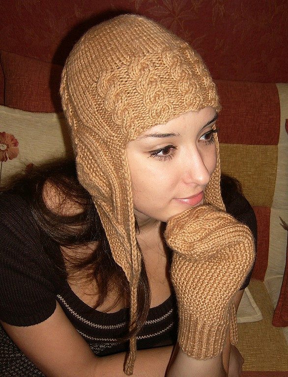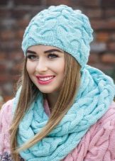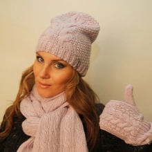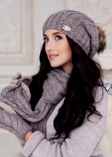 A hat with a pattern of braids perfectly complements a long scarf and mittens from similar yarn, knitted in the same style.