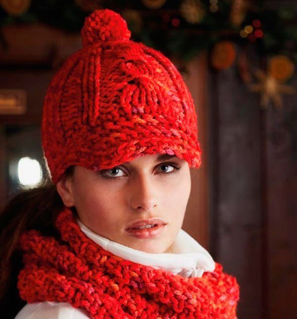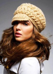 Another recently fashionable model is a knitted braid hat with a visor. The miniature visor not only gives the product a stylish look, but also protects the eyes from rain and snow. If you decide to tie this model yourself, then you can play with the cut and tie it in the form of a beret.