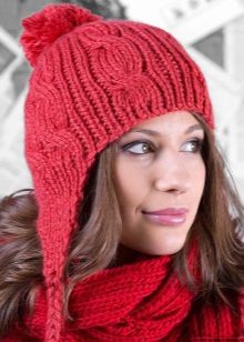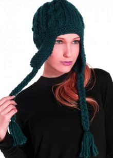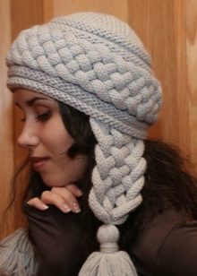 A very popular model with braids, which has a lapel, which can be double. By the way, volumetric braids can decorate only one lapel, which is knitted with a transverse web and sewn separately. The main part of such a cap is usually connected with a satin strap or elastic. This headdress is almost everything and is combined with many items of clothing. Yes, and even a beginning needlewoman can knit such a hat.