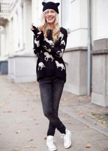 Kotoshapki look good with a down jacket or jacket. You can combine them with parks, light and denim jackets. The most ideal option to use these hats with clothes in casual style. Then you can, under the whole image in general, pick up sneakers or high fur boots, depending on the season. In the summertime, light cat-caps will look good with shorts or sarafans. But with all these rules, stylists recommend wearing a hat with any outfits, from among your favorites. Do not do this with evening dresses and costumes. Given a wide variety of caps, you can choose the appropriate, no frills style for office clothes. Best of all, if it is a hat. In this case, the headdress will become a softening element of the whole strictly image.