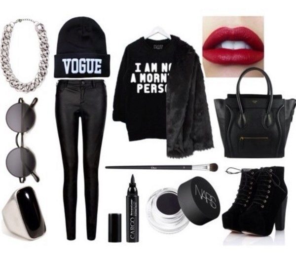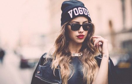 The “Vogue” hat looks good with a black leather jacket. You can use various accessories and leather leggings. A beautiful addition to the image will be a bright and bold makeup.