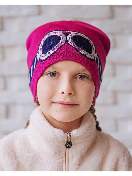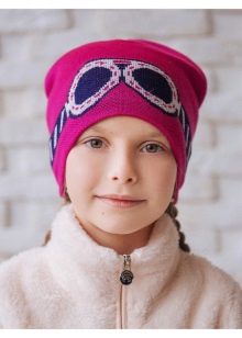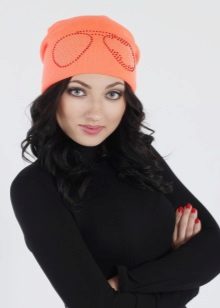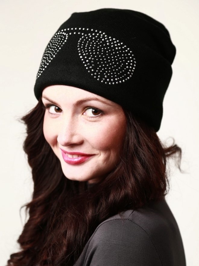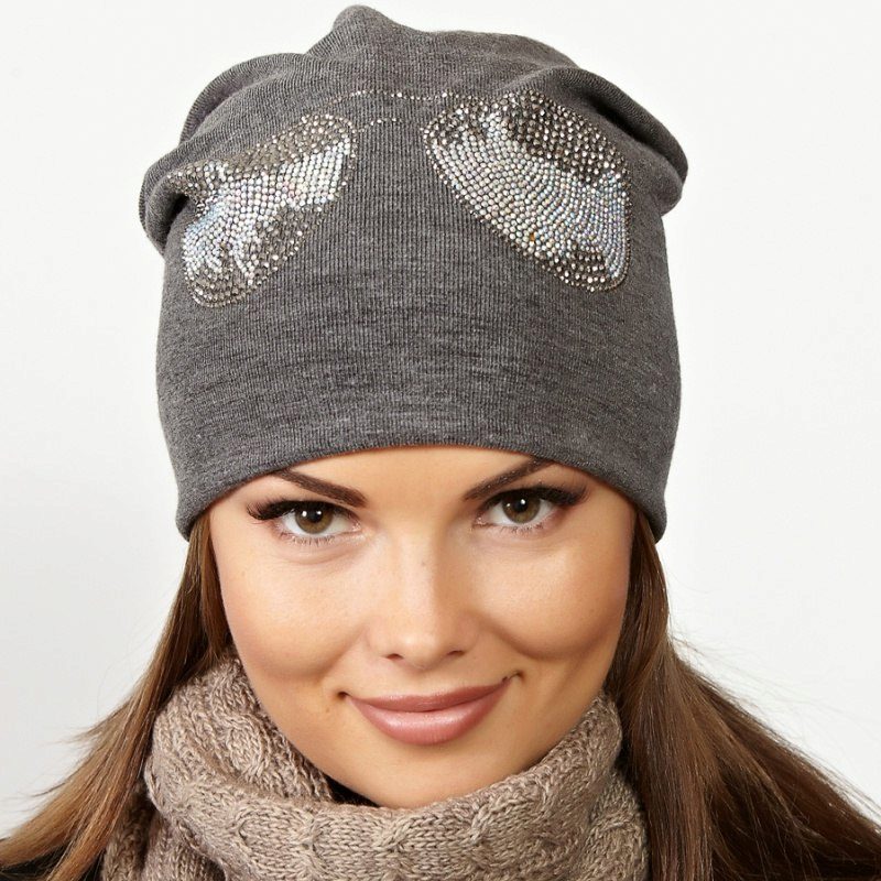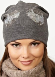 - Female version - knitted hat with fashionable appliqué of rhinestone, which imitates regular or sunglasses. According to the style most likely it will be a hat-bag or a hat with a fur pompon. The colors are varied, so you can choose an accessory to your taste. Wear such hats with sport-style down jackets or youth fur coats. The price is democratic: from 800 to 1500 rubles.