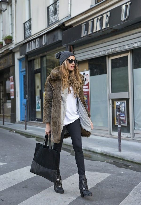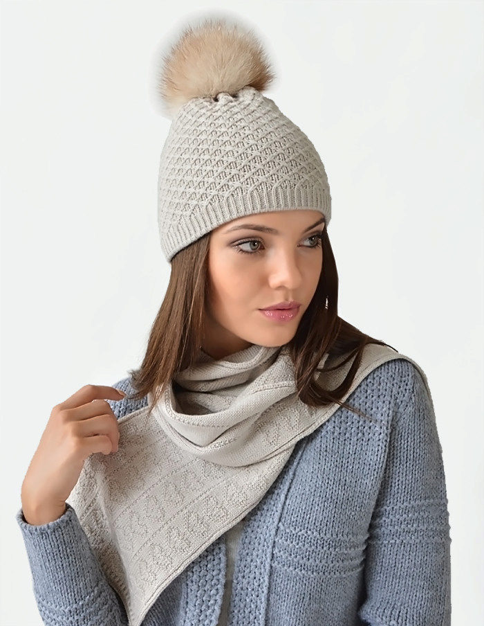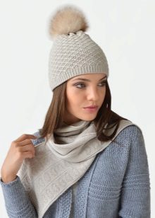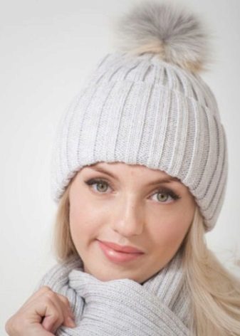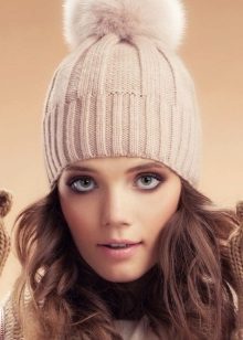 In case the headdress is chosen under a classic coat, a monochrome hat with a pompon will become an ideal option.. The model with a fur pompon will perfectly complement the image created on the basis of a down coat. The absence of a fur collar on the coat will not interfere with putting on such a hat - it is enough to add a fashionable scarf to the image.
