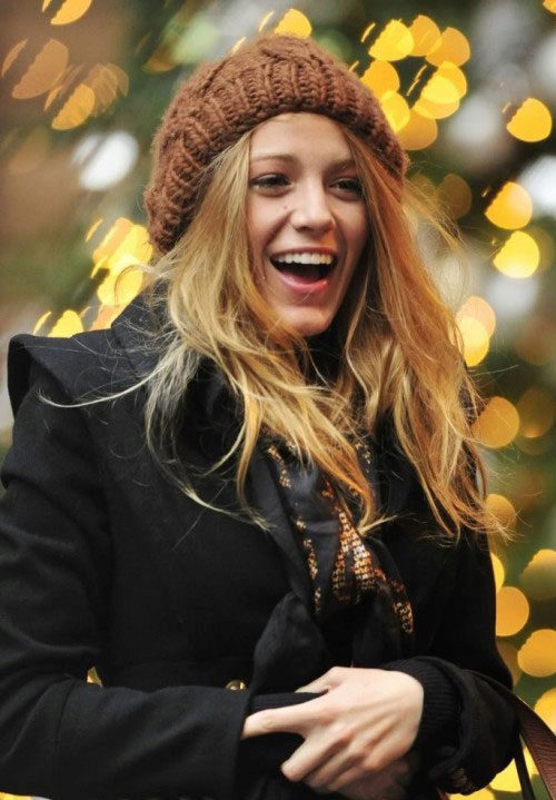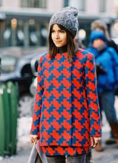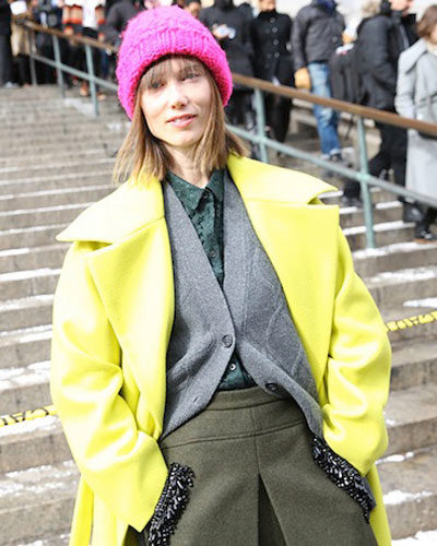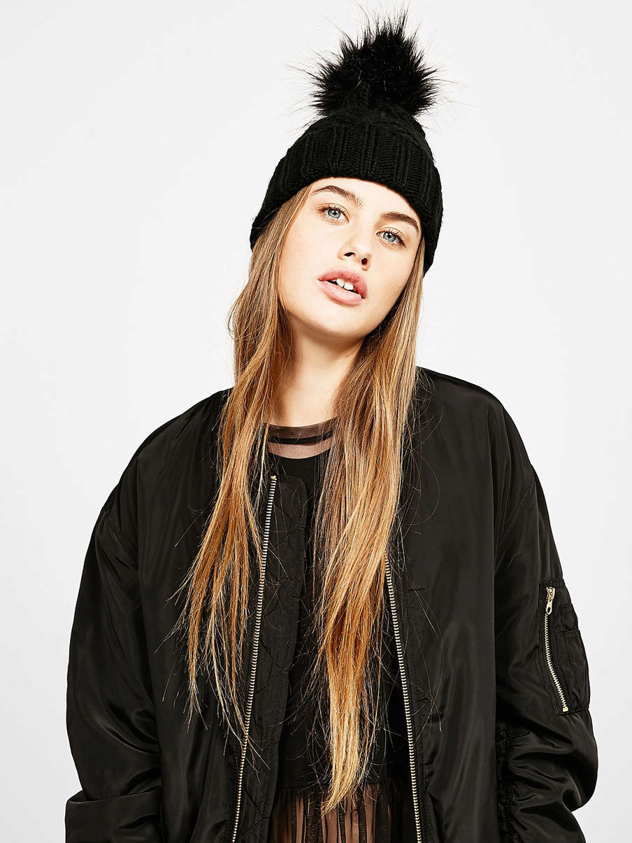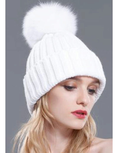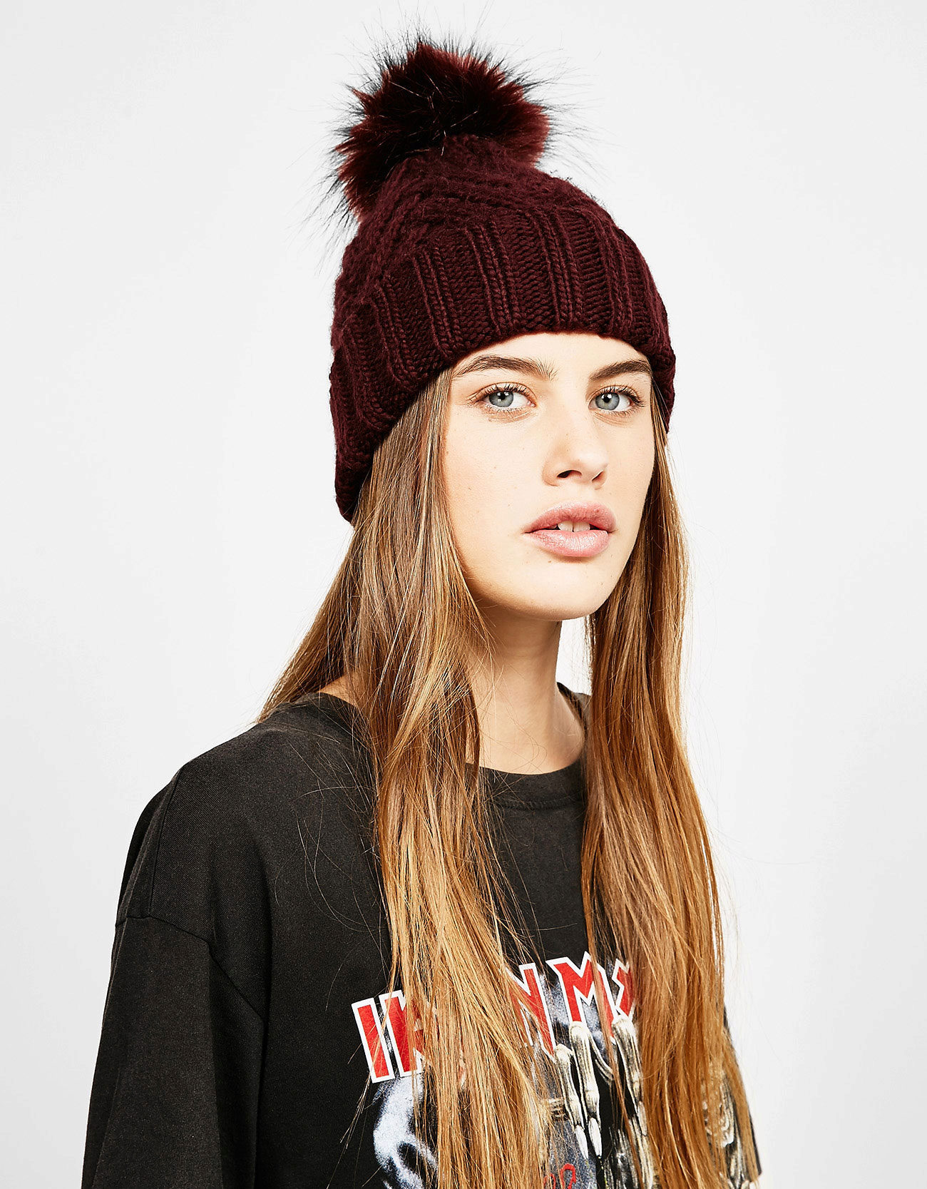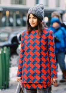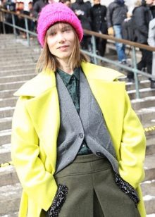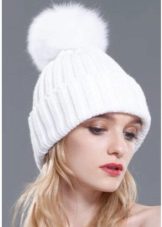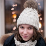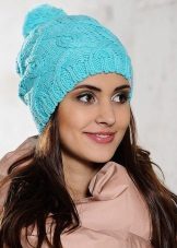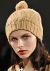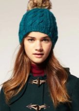 - A naughty hat with a pompon made of yarn or fur will be appropriate in a duet with a sheepskin coat - you will create a playful and creative image. Moreover, the headdress can be a bright color (for example, bright blue). Note that a knitted hat braid should not be combined with a classic coat or suit, if you, of course, do not like shocking.