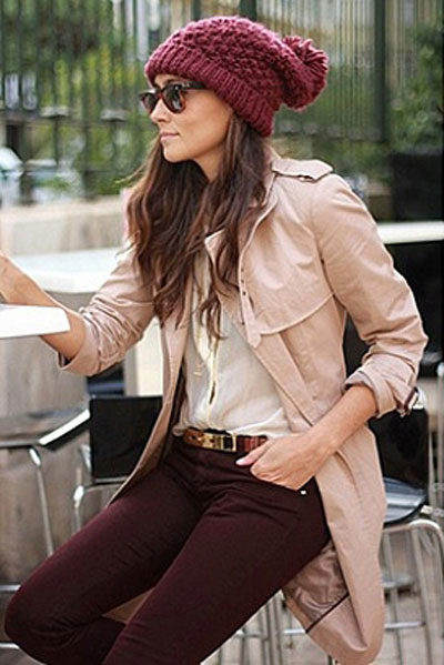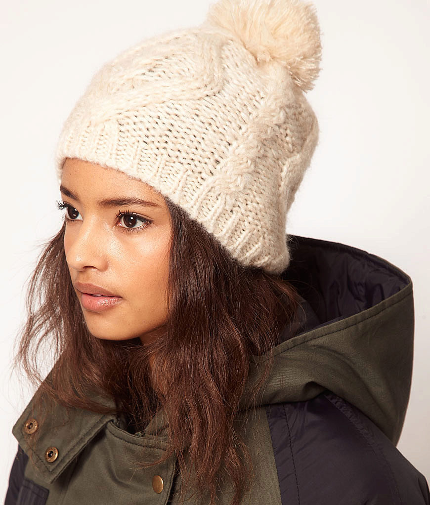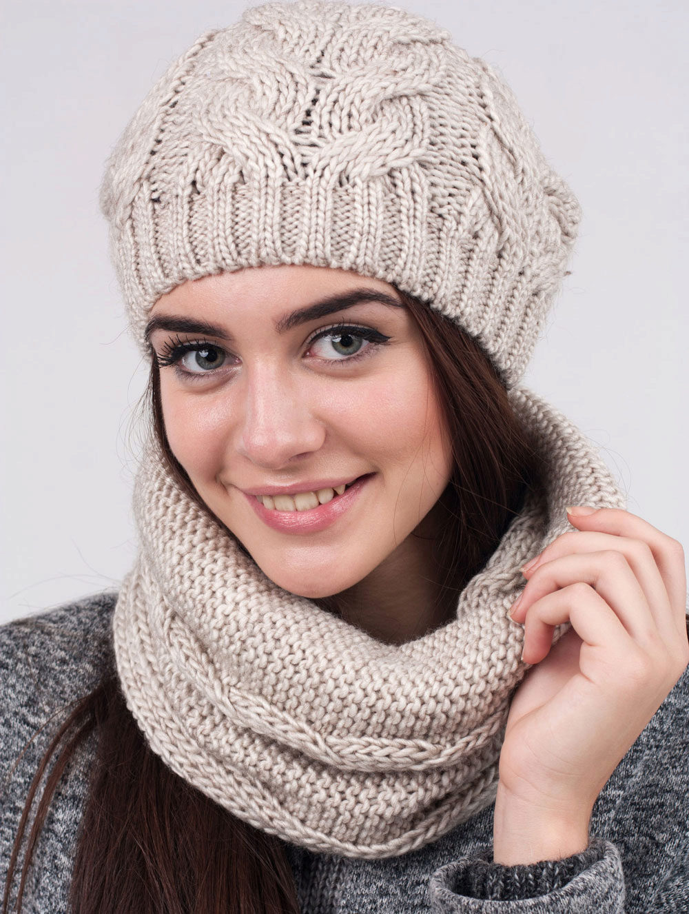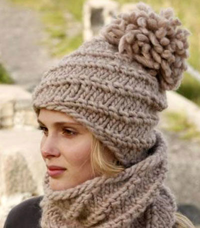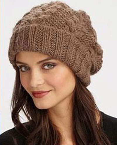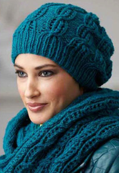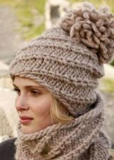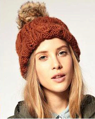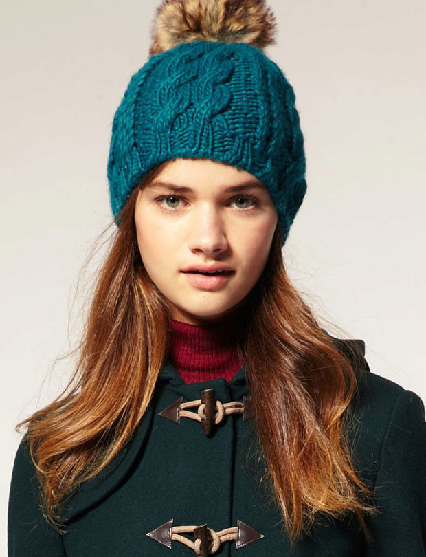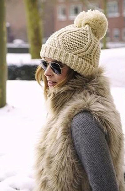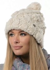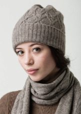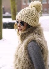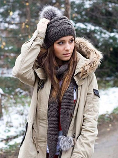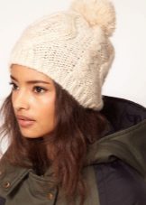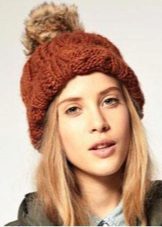 - Knitted braids hat harmoniously looks with a down jacket or a park. They can match in tone or be contrasted (in the latter case, it is desirable to choose a scarf to match the hat). This image is well suited jeans, big bag and boots without a heel. By the fur coat you can pick up an elegant beret with an Aran pattern of restrained colors.