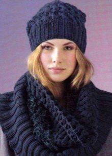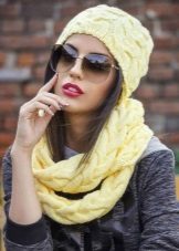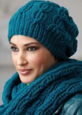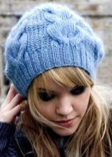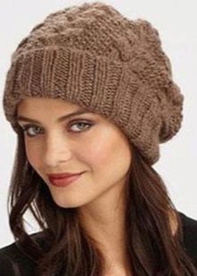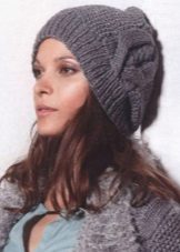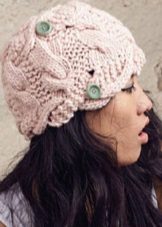 - Lightweight hat with a pattern of braids looks great with a knitted tunic and leggings. From above on such set it is possible to throw a jeans or leather jacket. Also with this headgear a cardigan or sweater associated with the same pattern or a single color solution would be appropriate.
