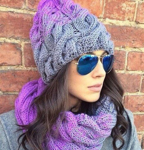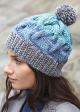 Caps with braids knit in different colors. These are mainly monochromatic items, especially the Aran pattern is advantageous and looks on a white canvas of smooth threads (as well as on other light shades). Interesting gradient products - when one shade smoothly turns into another (for example, pink through white - in blue, or purple through blue - in white). Some needlewomen knit colored braids on a contrasting canvas.