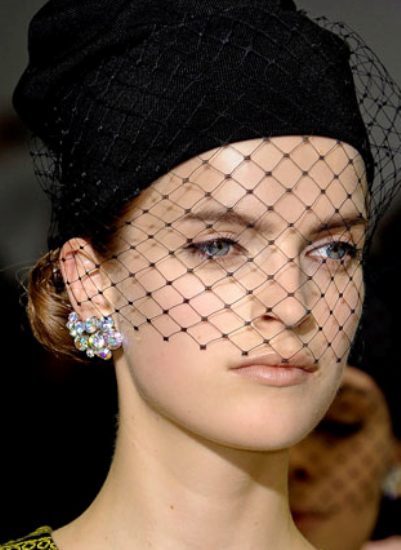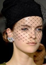 A photo from a fashion show is a good example of how large jewelry combines with a hat and a veil. They do not enter into dissonance, do not interrupt each other, but rather serve as an excellent complement to the image.