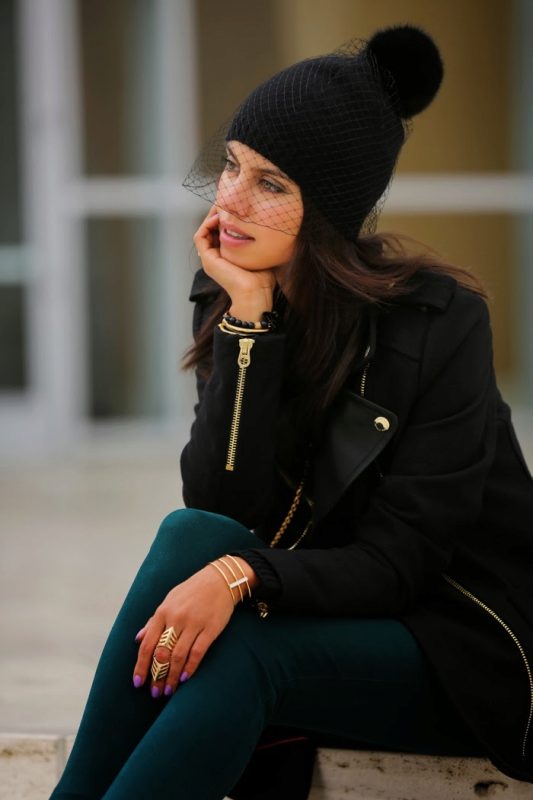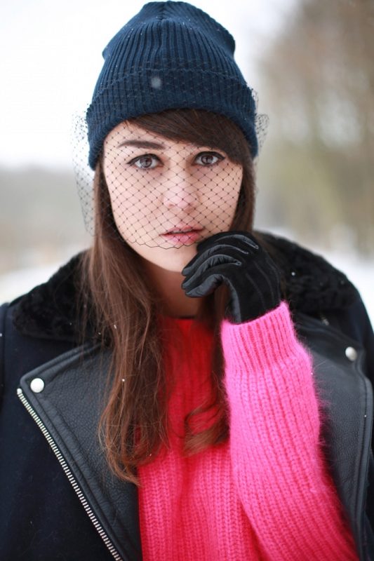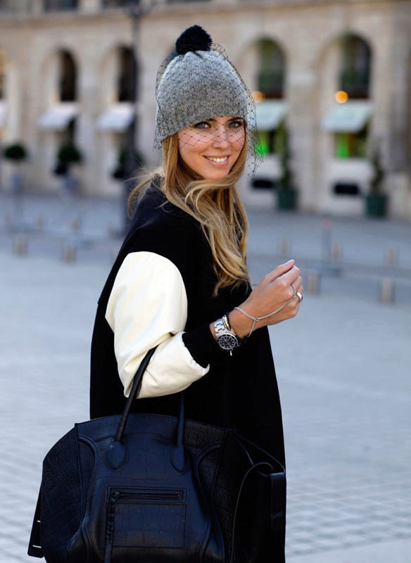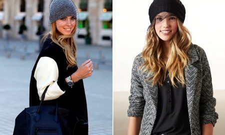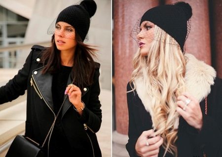 Hats with a pompon and a veil, at first glance, a combination of incompatible. In fact, a beautiful bow, whether it is a coat with a fur collar or an elongated coat. In any case, this is a city casual image for an active girl who is in a hurry to work, study, or simply walk slowly around the city.