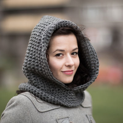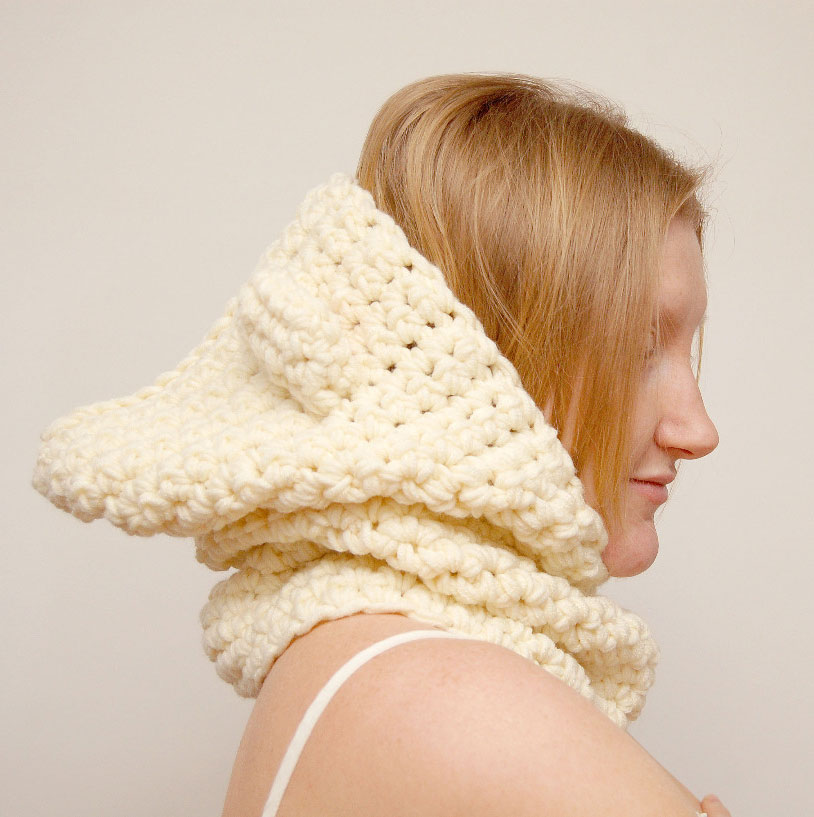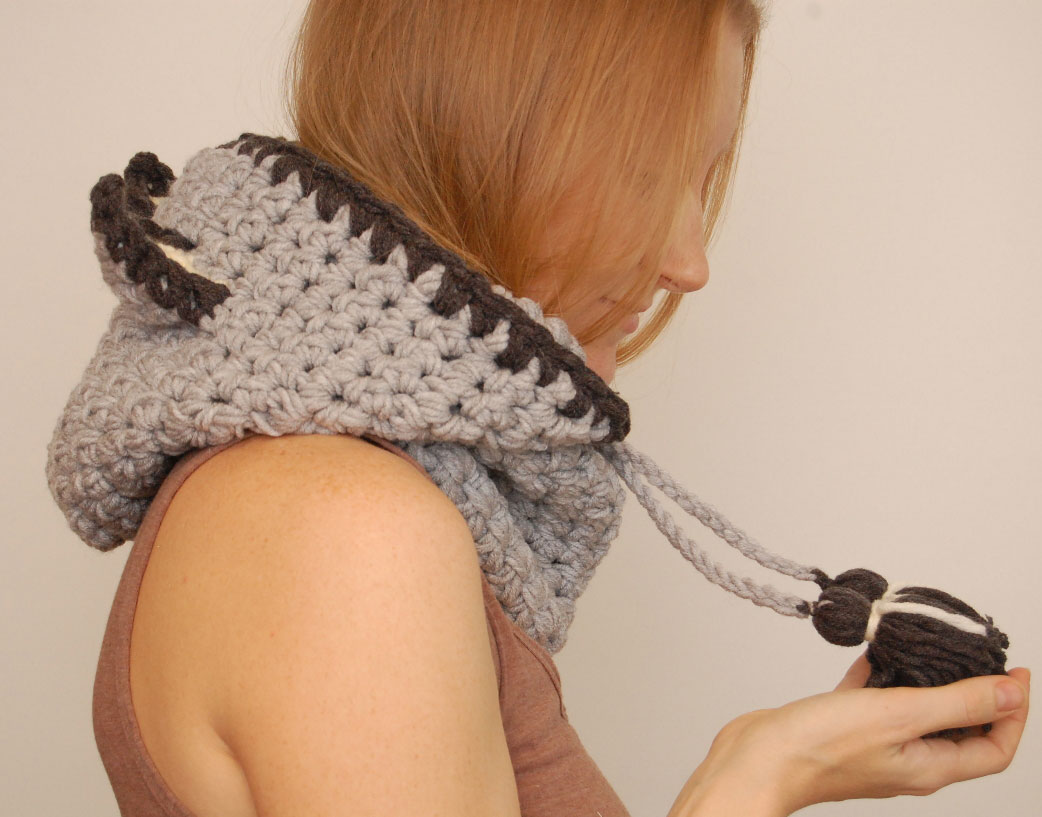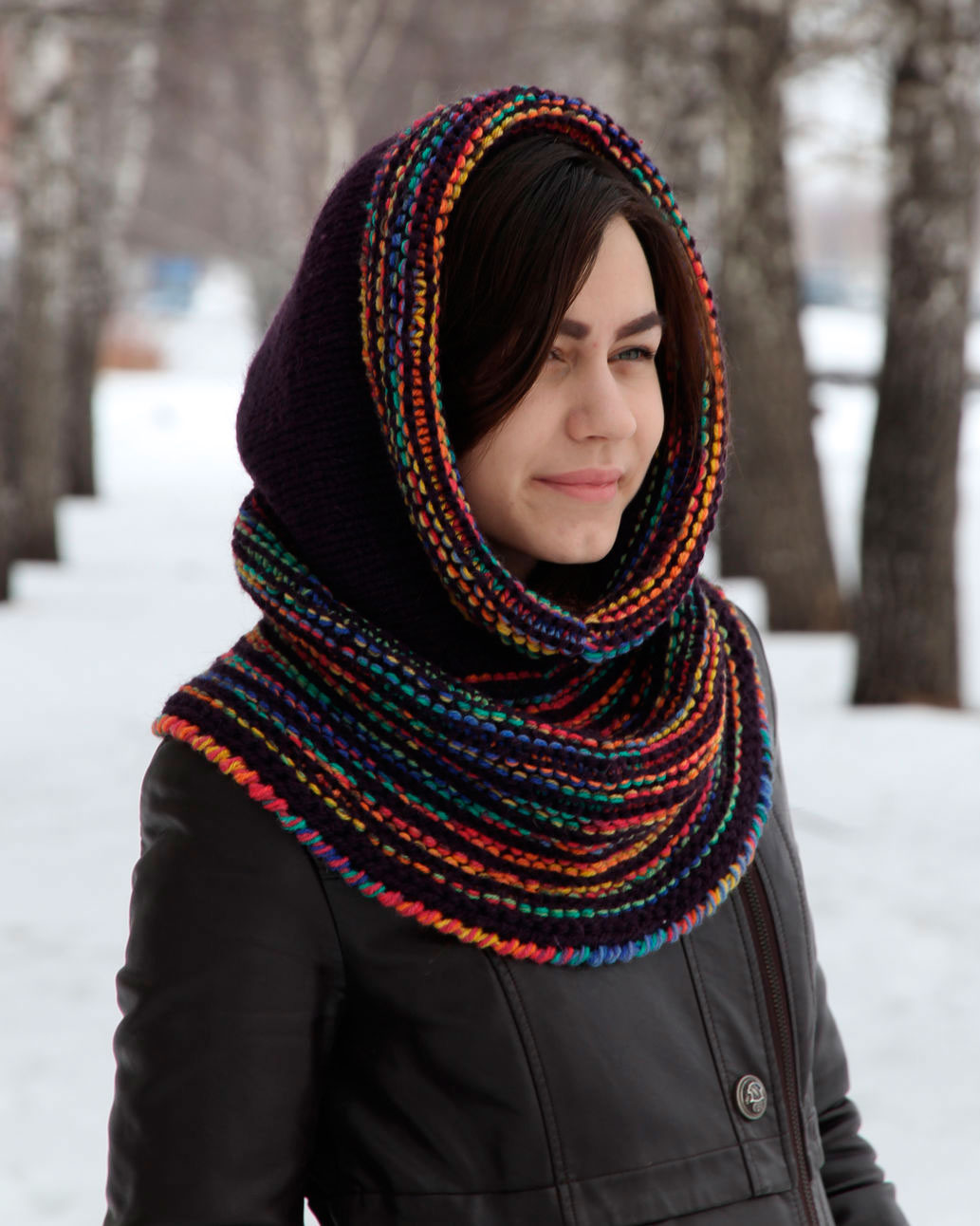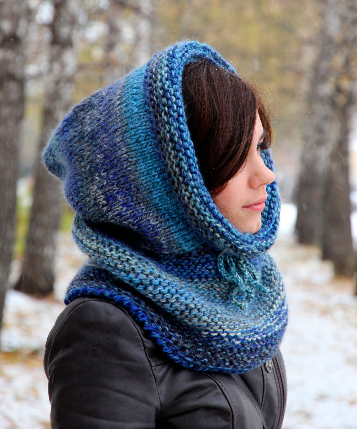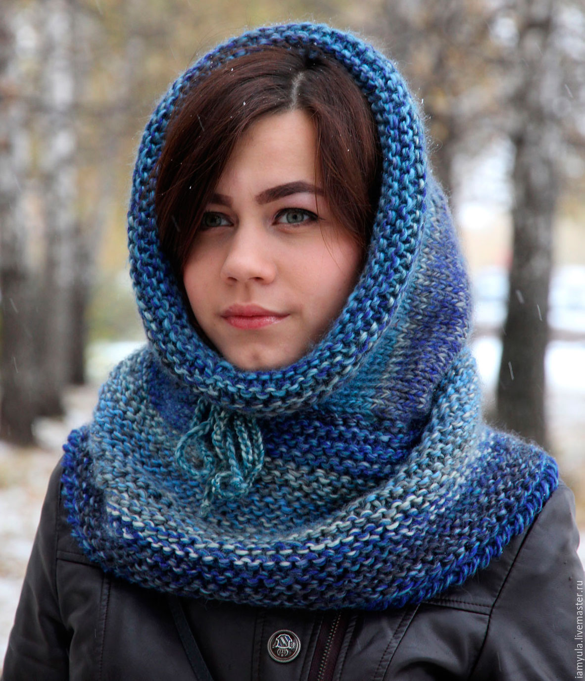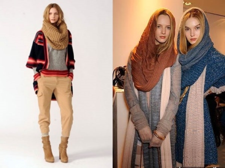 The most current and stylish - knitted models, they have large and medium knitting. If you take a wide and long scarf, fold it in half and sew a little along one of the lines, you get a stylish accessory with your own hands. The long ends of the hood can be beautifully wrapped around the neck and secured with a brooch or a flower.