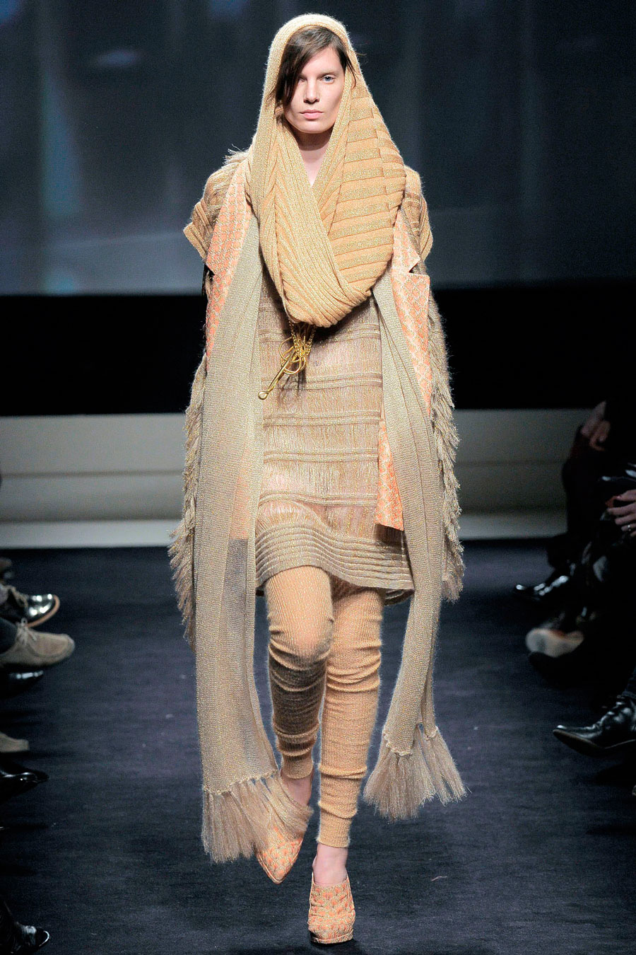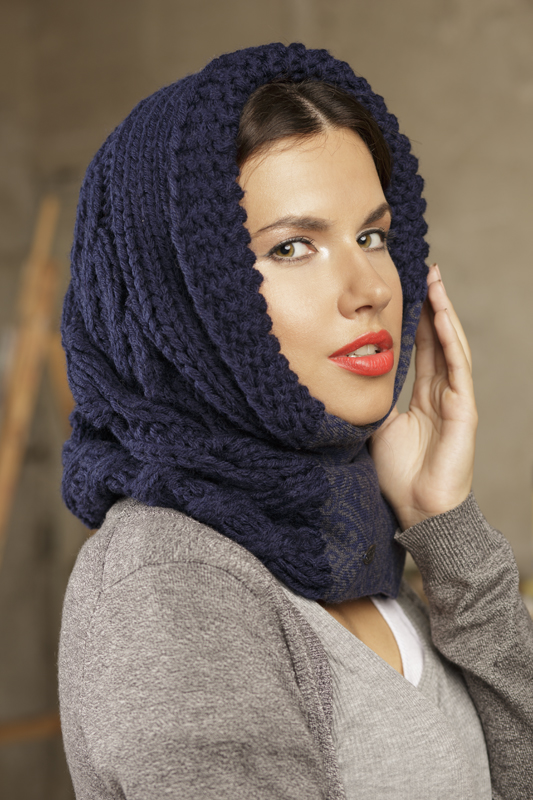The image in military style will harmoniously complete the large knit hood of coarse thread of brown, beige, olive and black shades.