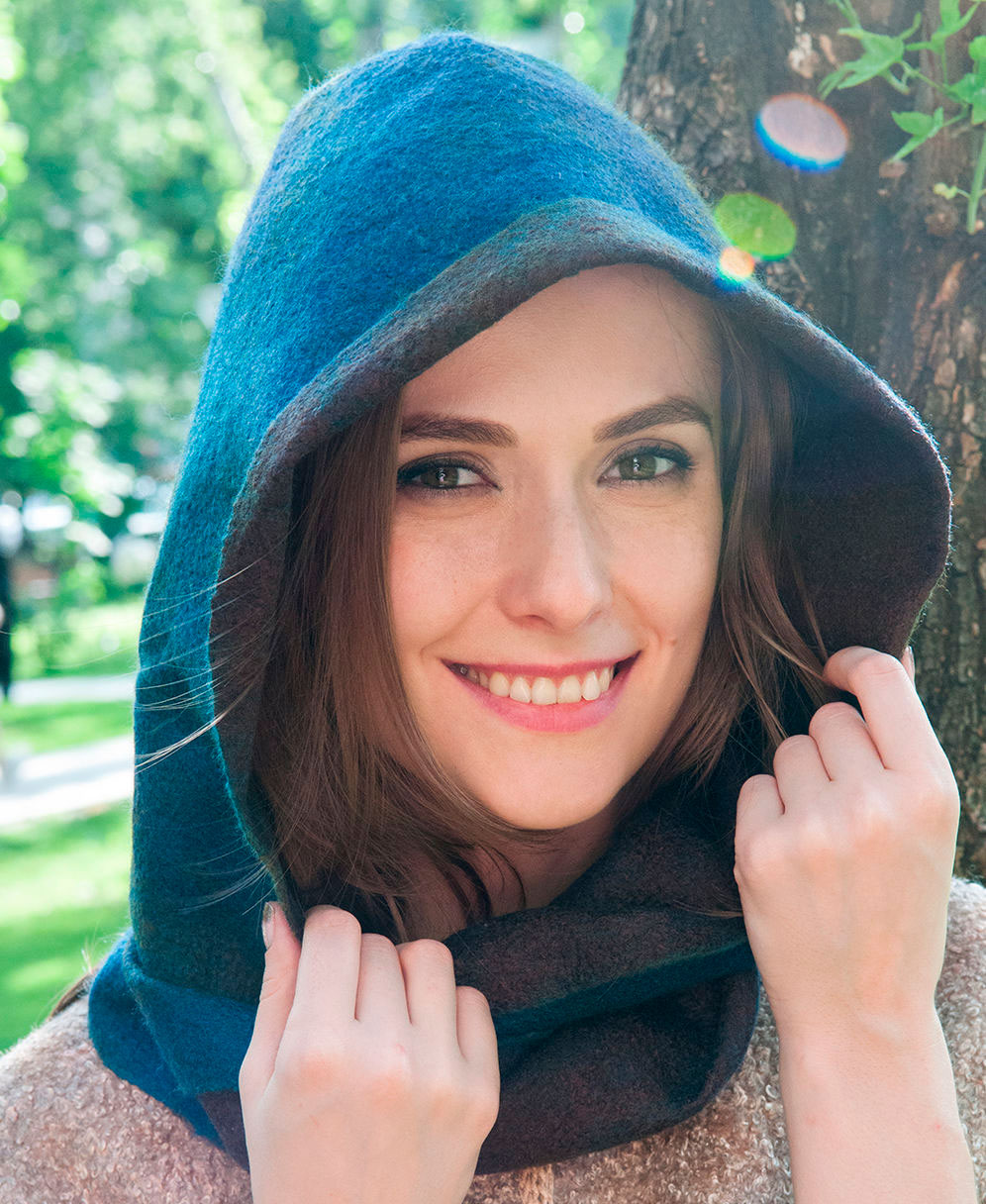It is so convenient - when you enter the room and throw away the top of the hood, a stylish wide scarf remains on your shoulders, and when you need to go outside again, you can put it back on in one motion. Ideal for travel related work.