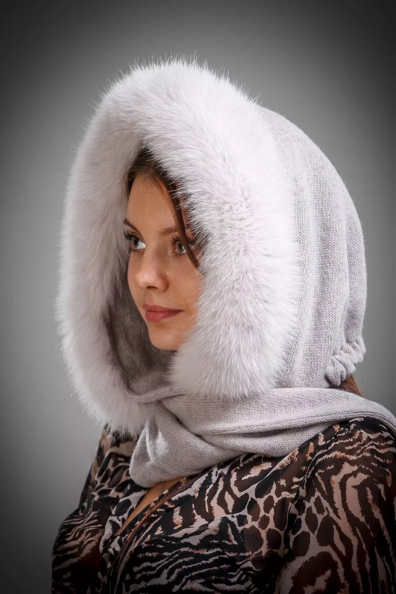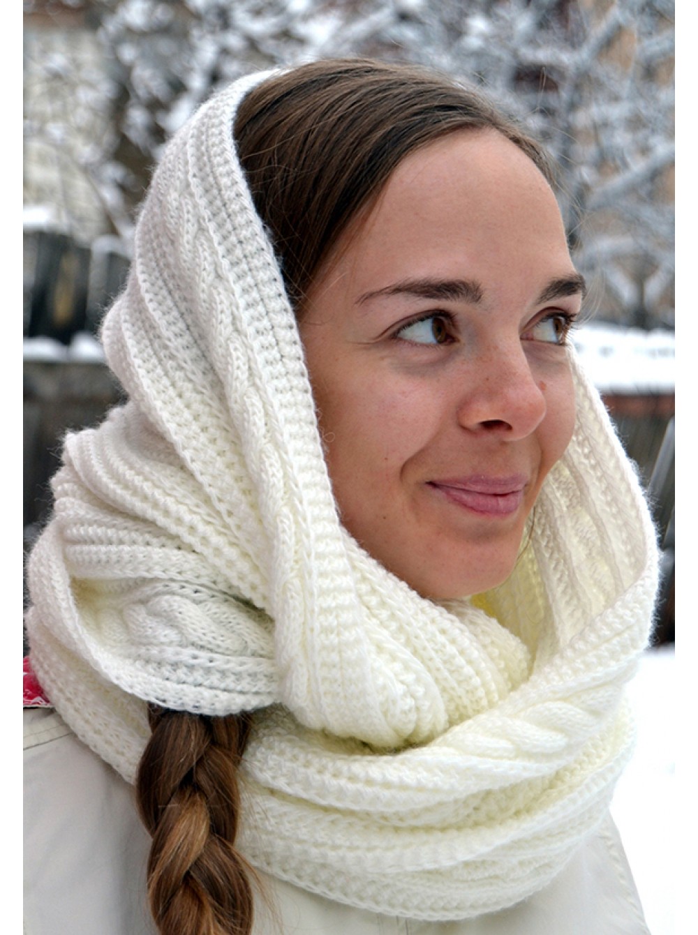 There are many solutions that allow you to wear a transformer hat. Knitted models look good with all outerwear. If the jacket is a bright color, pick a stylish hat-scarf to match. Outerwear pastel colors in harmony with snow-white headdresses.