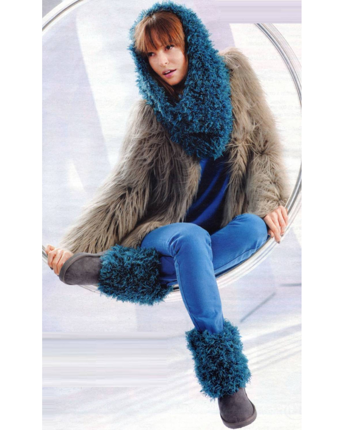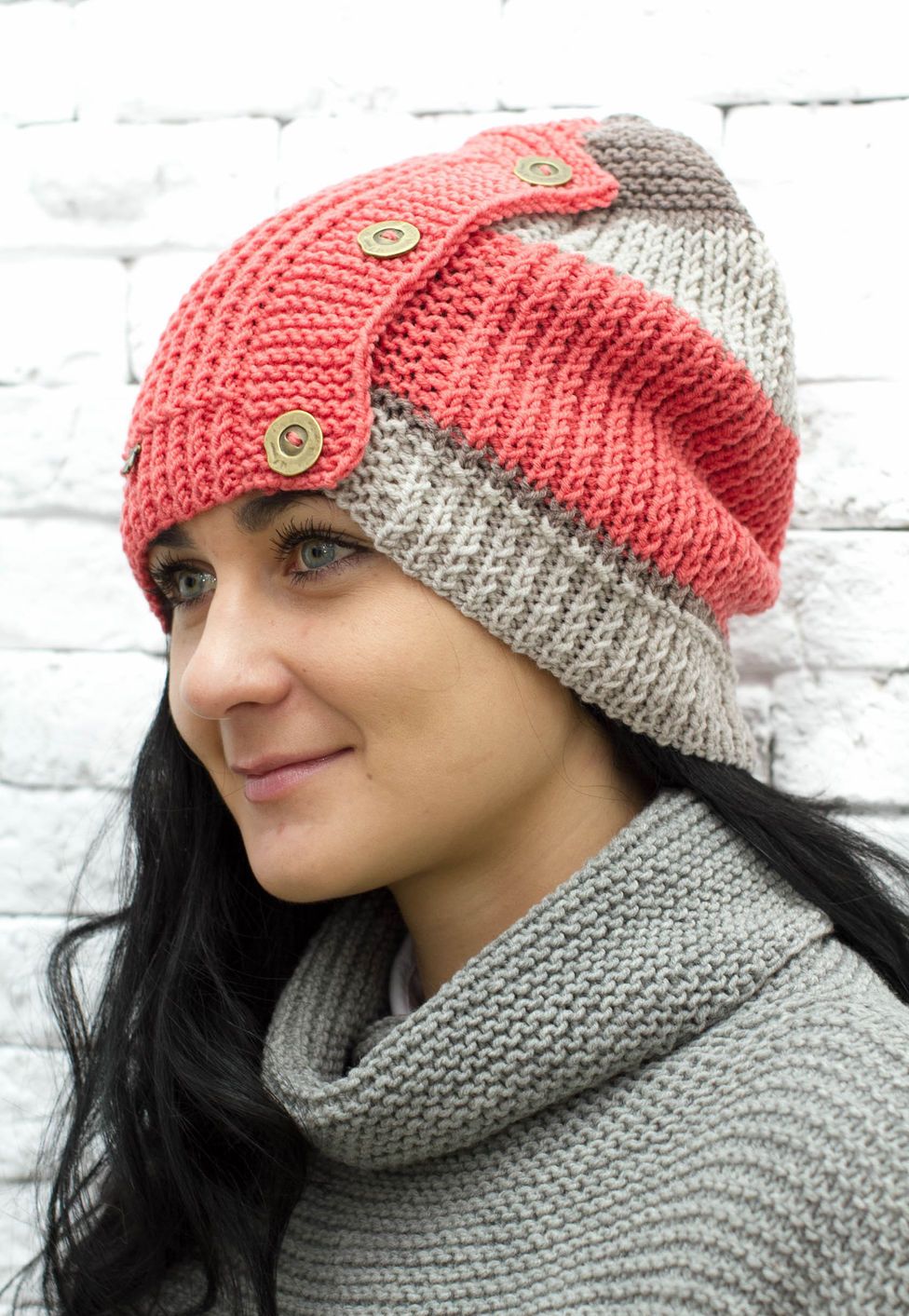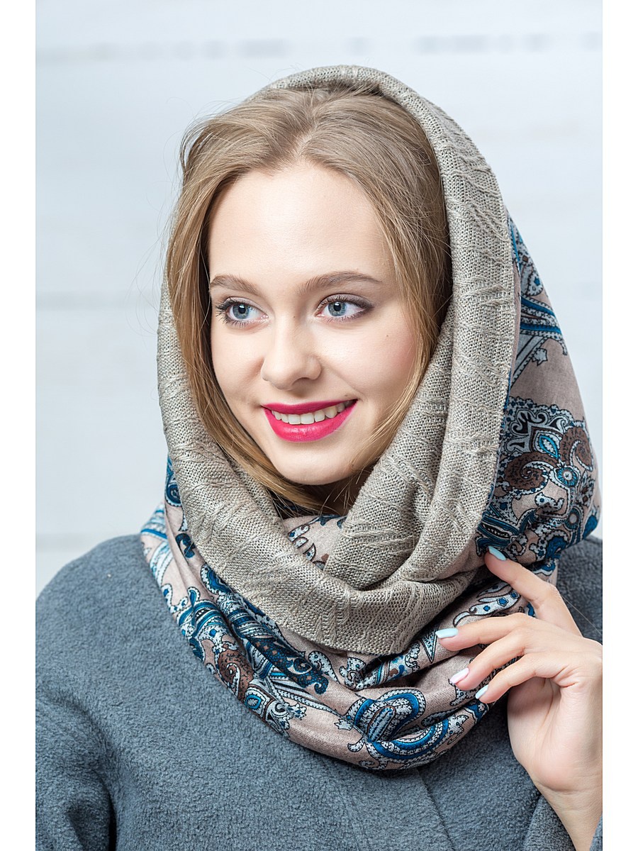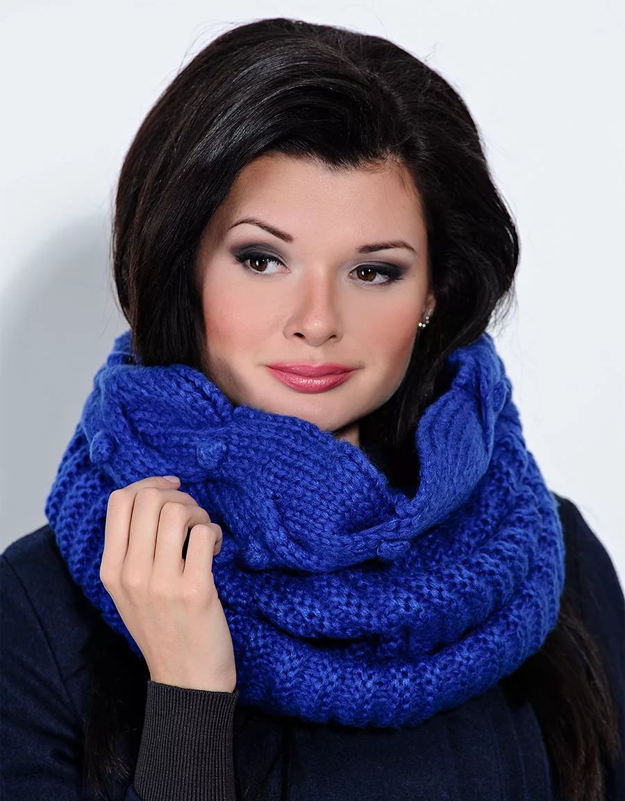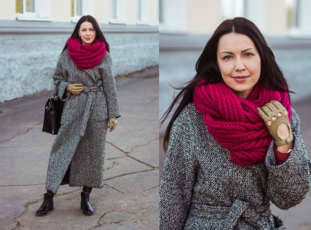 It is interesting that even the most inconspicuous coat can be revived with the help of a bright, original knitted hat-snud.
