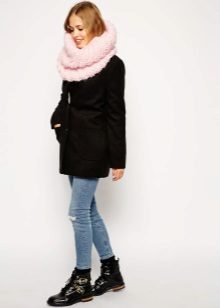 If the coat is a neutral color - black or gray, then you can pick up an interesting combination of two different colors of the coat. Products with different texture look great, for example, one is smooth and the other is volumetric, with braids and other decorative elements.