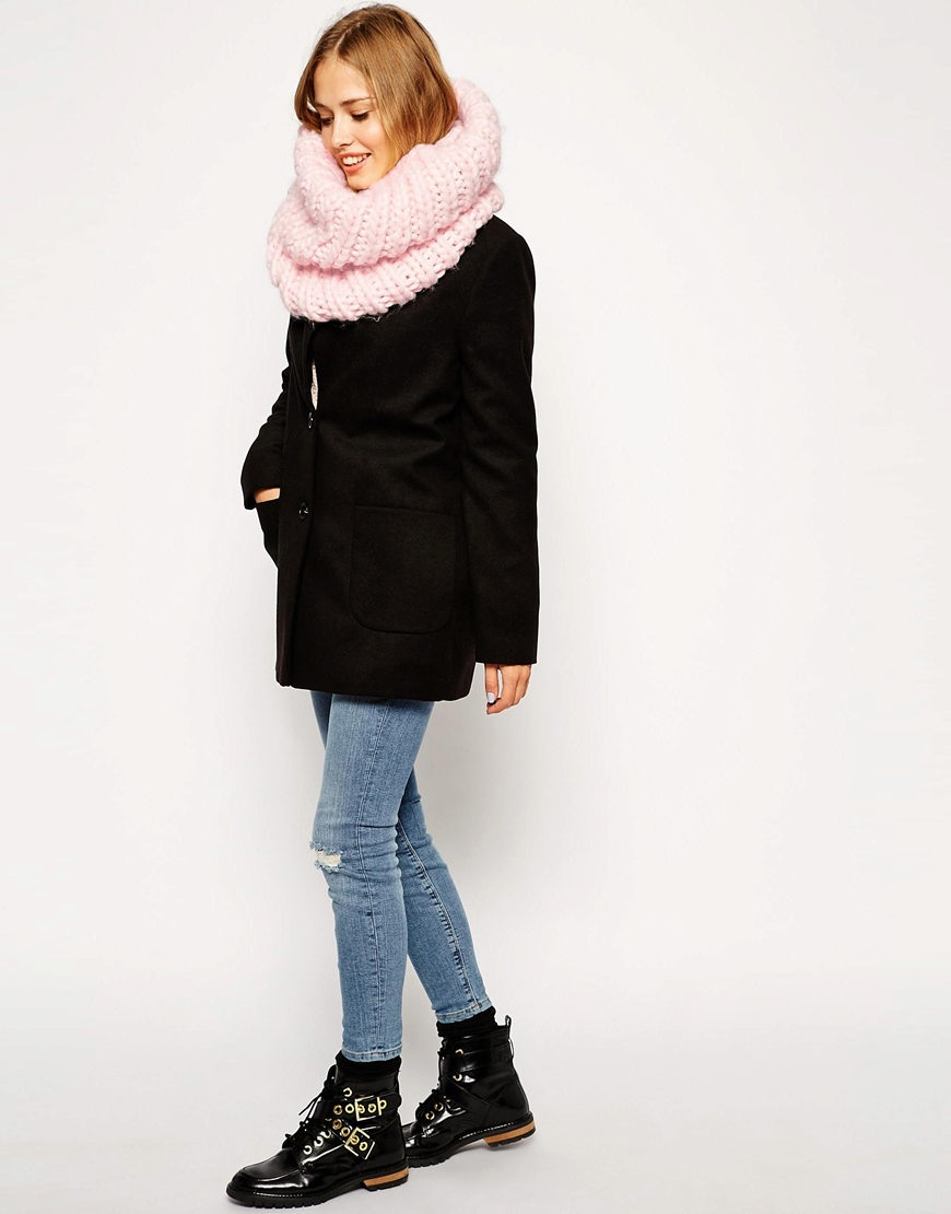 - In winter, wear a mint-colored coat with pale pink snood. Get a romantic image, made in pastel-candy colors. In order not to look too “cloying”, combine such a set with neutral-colored clothes and accessories. Perfect black, gray and brown.