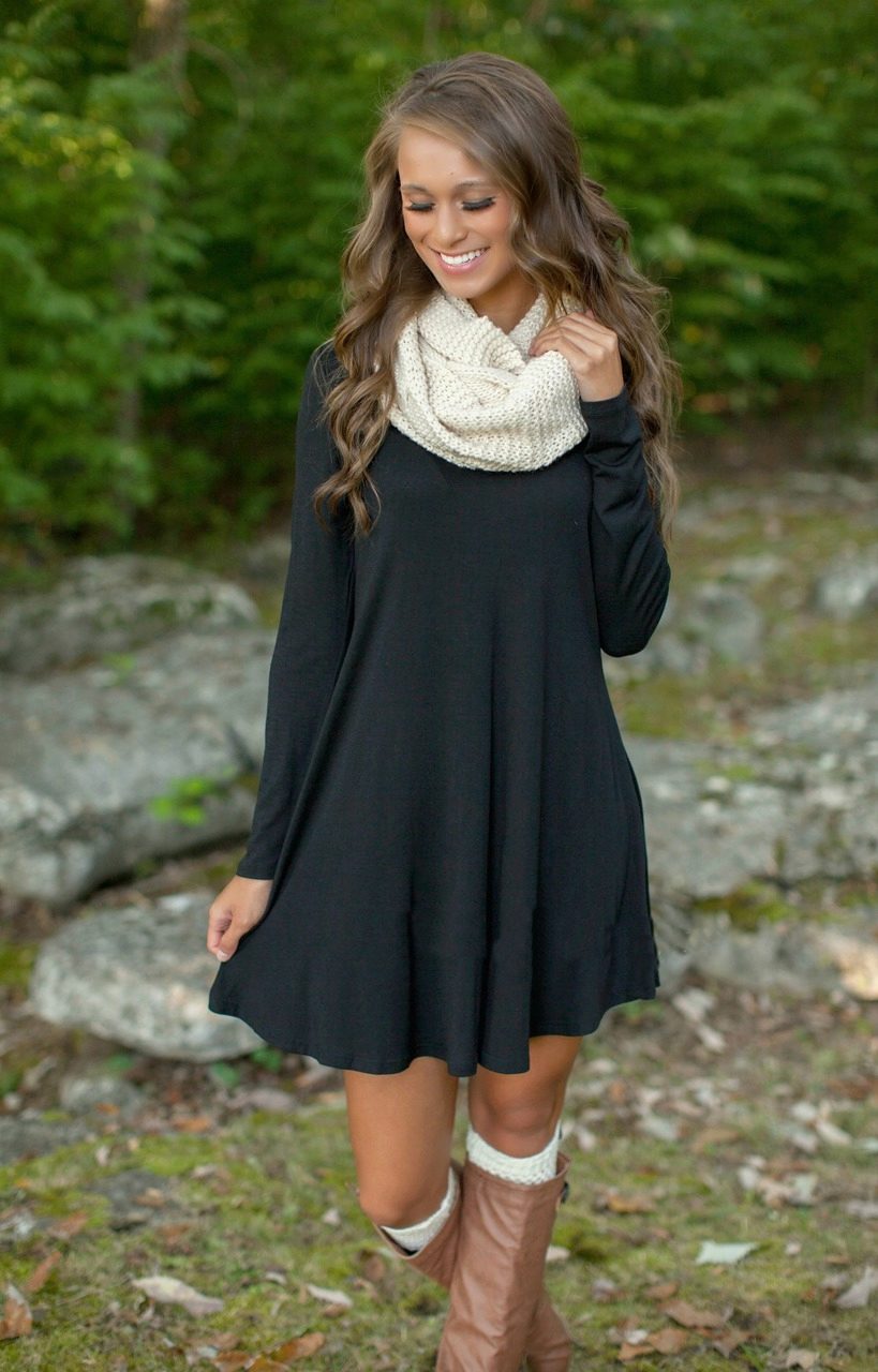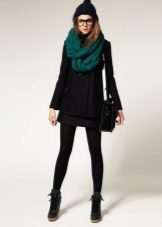 The white hat-scarf of large knitting in combination with a short dress of black color with a slight flush to the bottom looks beautiful, gentle and feminine. An ideal addition are brown boots with high tops on top of white gaiters in a tone scarf, which can be seen from under the shoes.