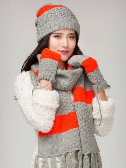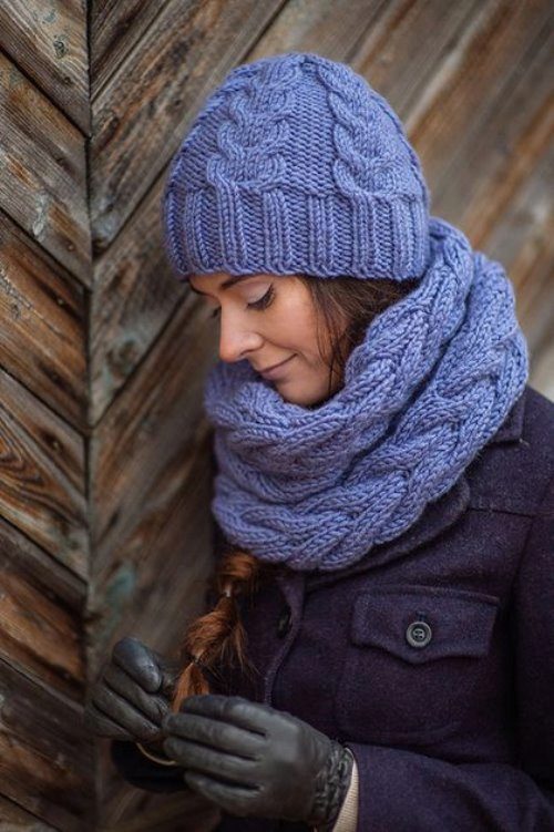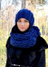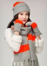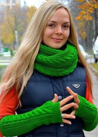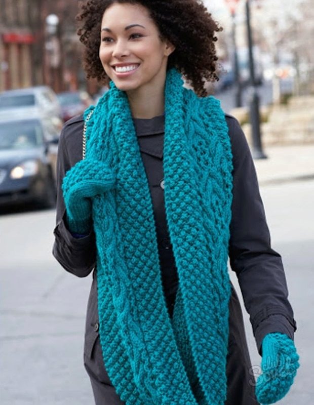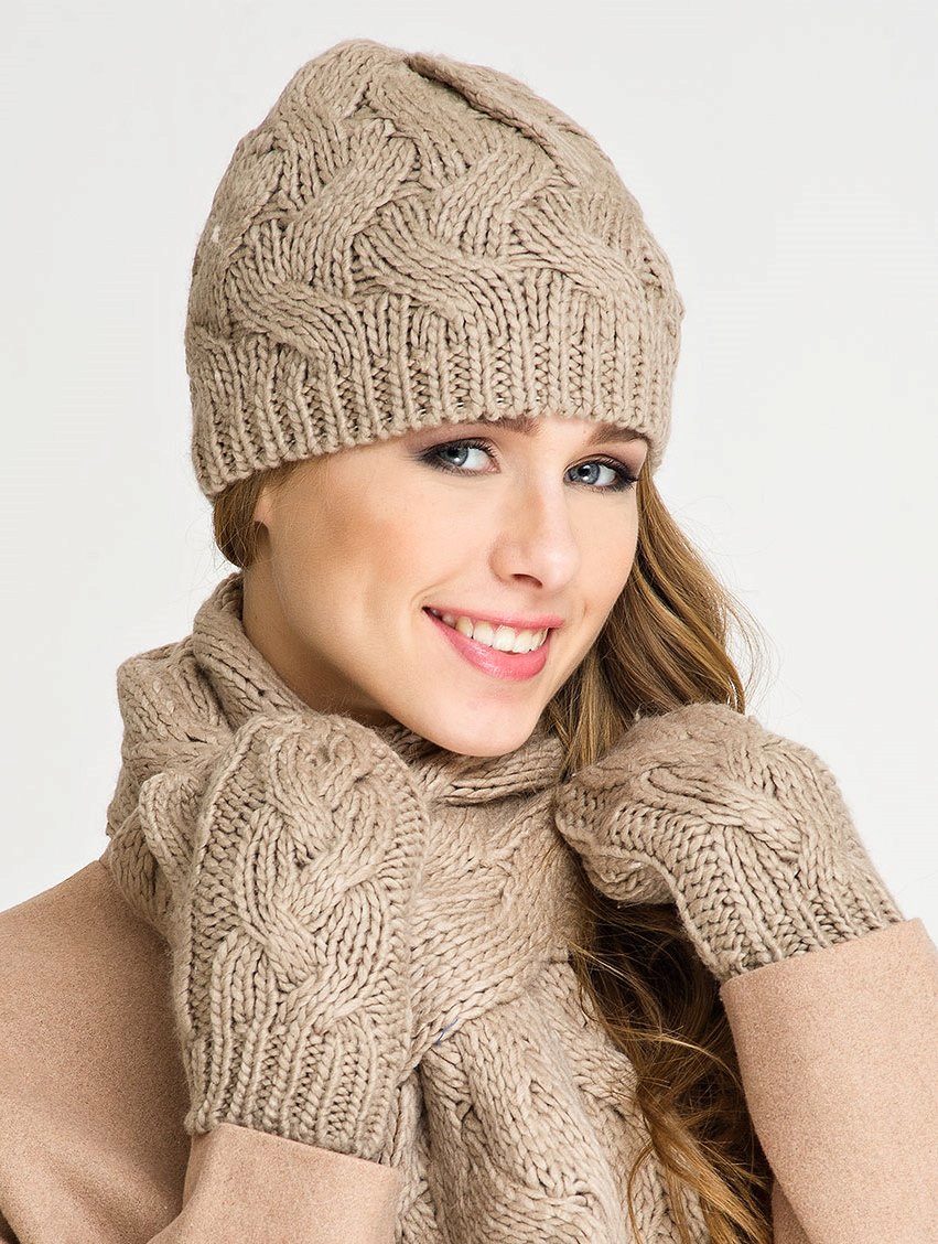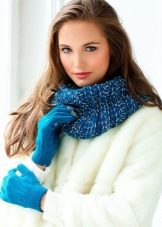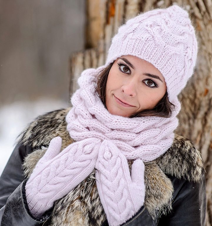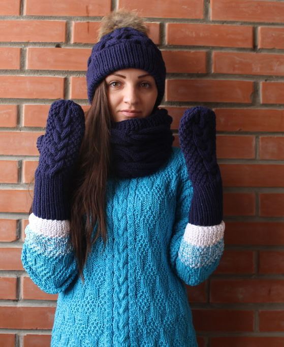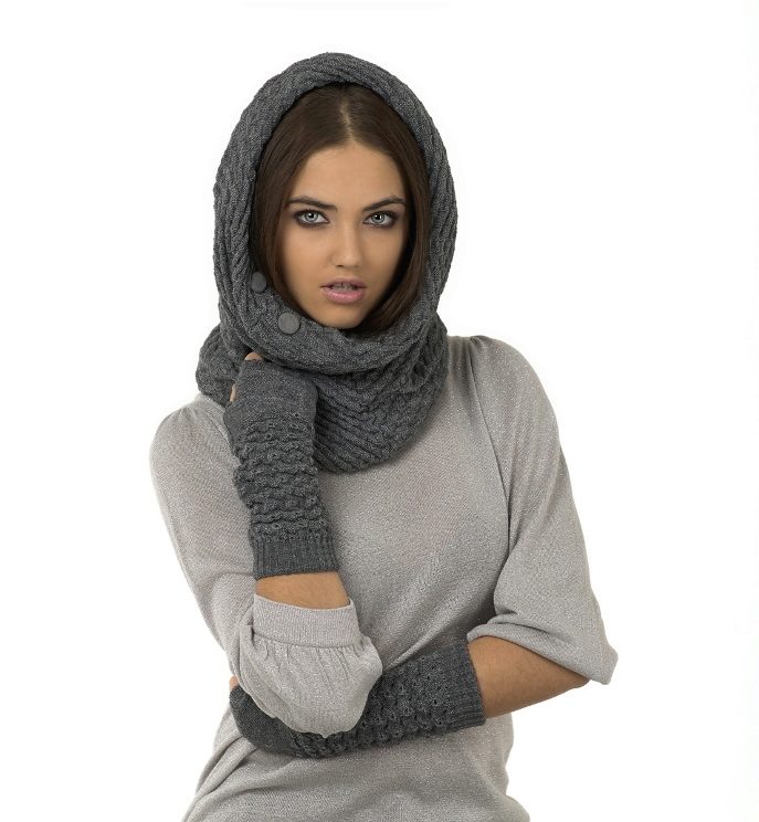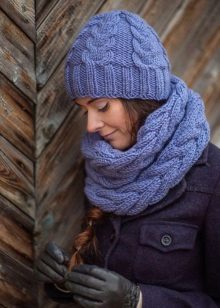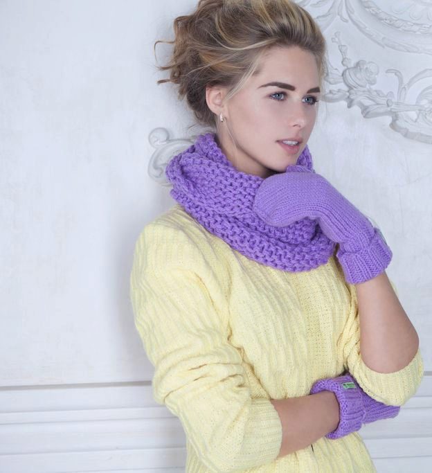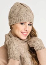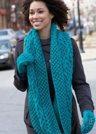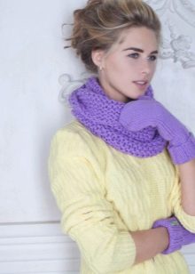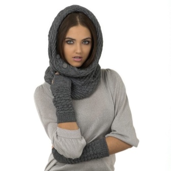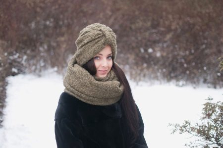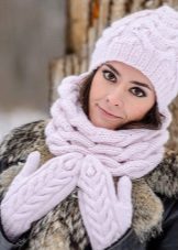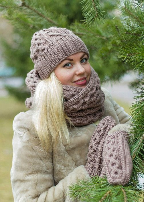 A set of scarf hats with mittens looks stylish and harmonious. All components are presented in a single color scheme and texture, therefore they give an image of charm and beauty.