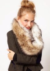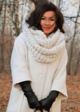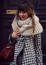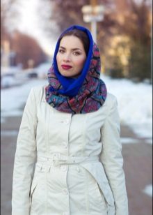 The scarf can be a bright detail in the ensemble with a coat. Looks great model of bright colors with elegant trim to the bottom of the product. This hat-scarf will also serve as a luxurious collar. An elegant and unforgettable image is guaranteed. To embody a harmonious bow, it is worth picking up a headpiece to match coat.