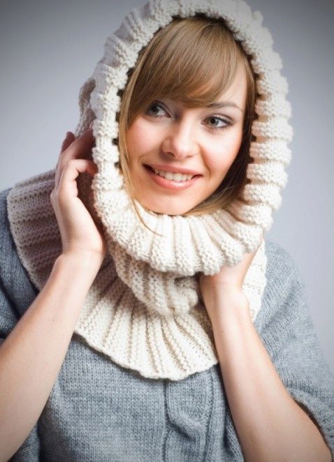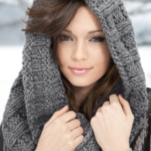The scarf is a great solution for correcting some of the flaws of the face. She should be worn in such a way that she tightly clings to her cheeks, and her lower part covers a bit of her chin. If it is necessary to give the model a volume, then it is enough to fold the cap in half.