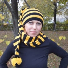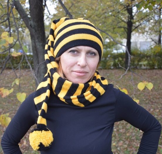 The cap-scarf a cap is one more popular version. The peculiarity of the model is that the long cap of the cap is used as a scarf. Today in the trend are monochromatic and color models. Often there are scarf caps with stripes. For example, a model with a yellow and black horizontal strip looks charmingly and spectacularly.