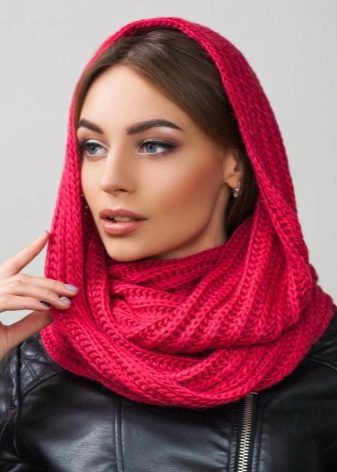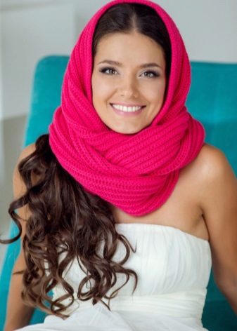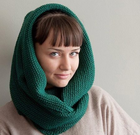 Snud is usually wrapped around the neck once, although it is possible several times. If the length of the product allows, the scarf cap can be wrapped even in two turns. In this case, one turn will be used as a scarf, and the second - a hat. Snood can be worn as a long loopthat will visually lengthen the image, add originality and unusualness.