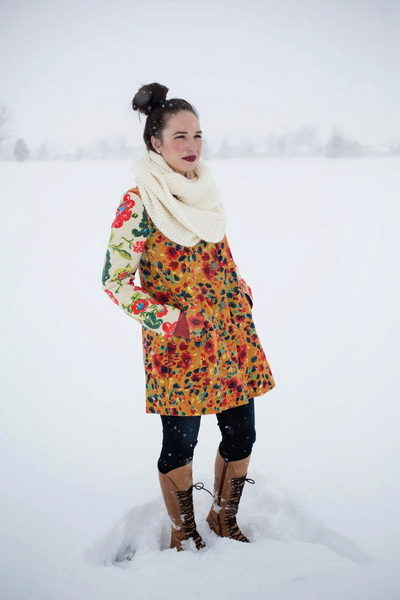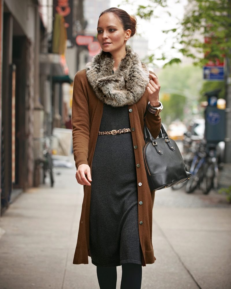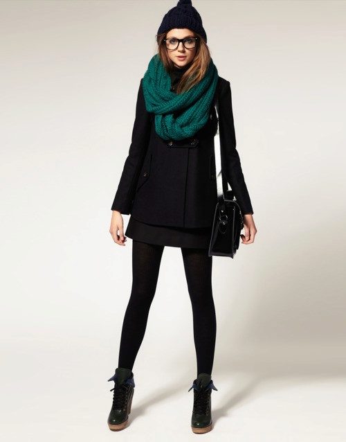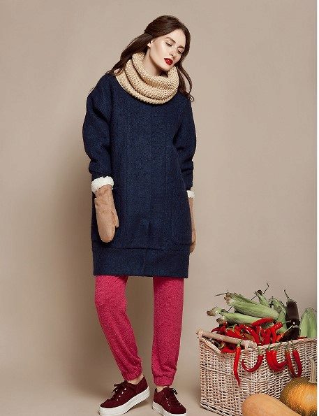 Autumn coat looks stylish in tandem with a scarf-transformer twisted around the neck. A stylish addition to the bow will be the mittens to match the scarf.