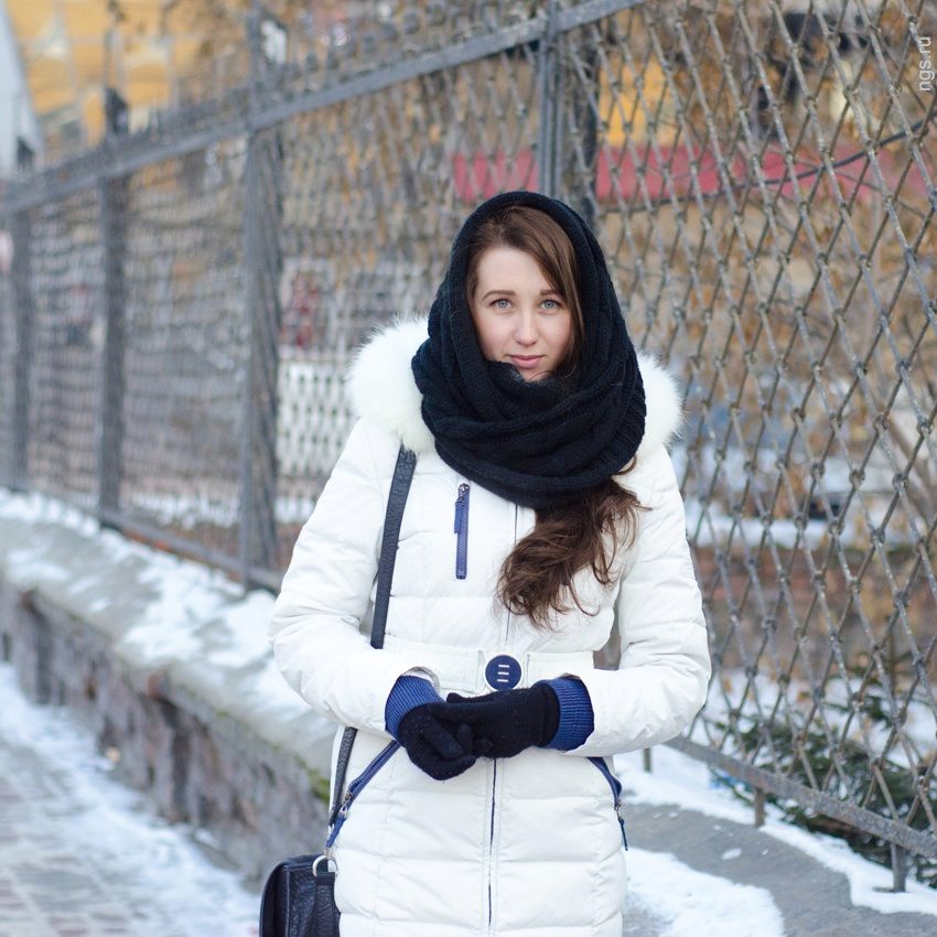 For the embodiment of everyday bow it is worth paying attention to the combination of a black scarf with a white down jacket. Gloves and a handbag in tone to the headdress will add to the image of harmony. The combination of white and black never goes out of fashion.
