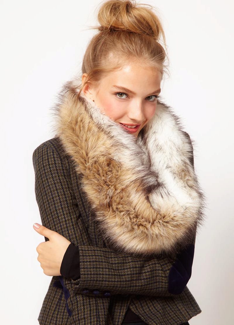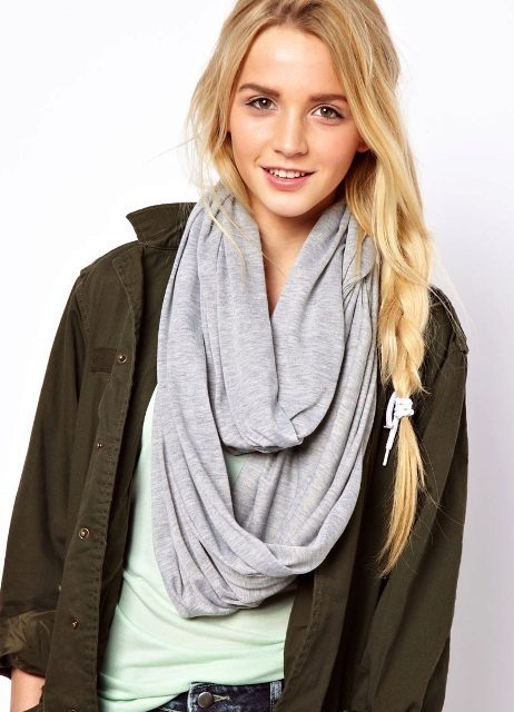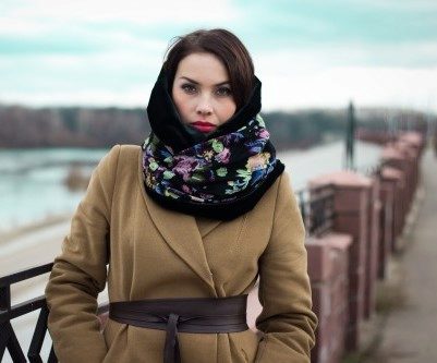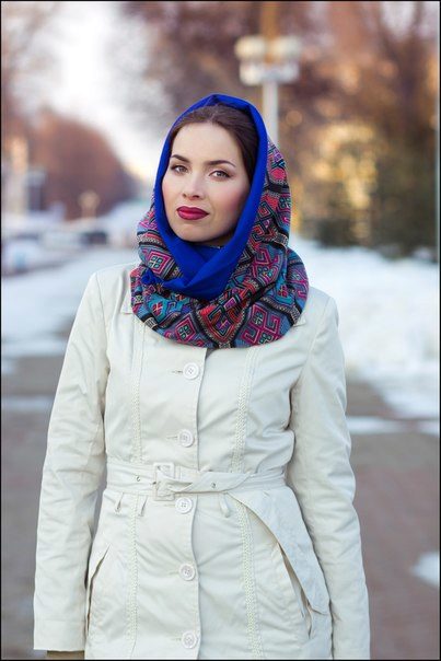 The scarf can also be worn with other outerwear - down-padded coats, fur coats, sheepskin coats, sports jackets, sweaters, etc. For outerwear in calm colors, a scarf decorated with an unusual print will be an excellent addition. For a bright down jacket, it is better to choose a cream or beige shade.