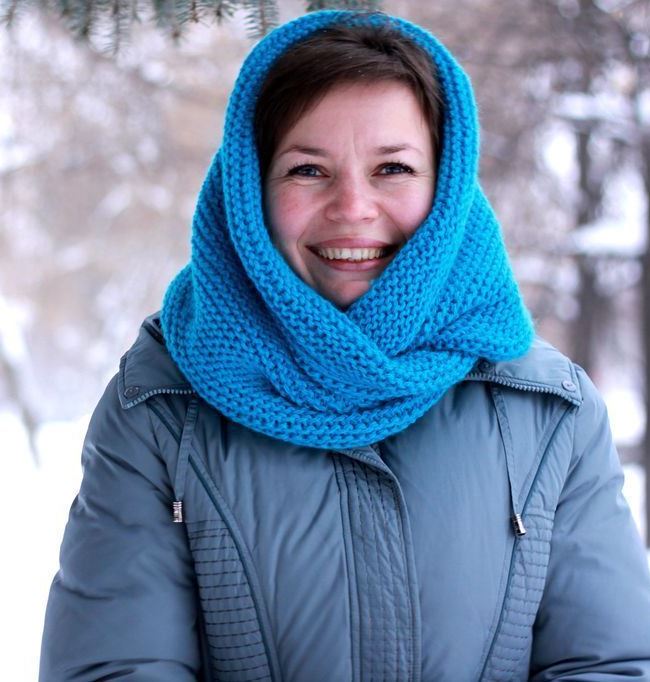 If desired, this item of clothing can be worn like a scarf. You need to stick your head through the hole and beautifully lay the folds. Cap-tube can cover half the back. The choice is individual. The convenience of this headdress lies in the fact that its length is easily adjustable.