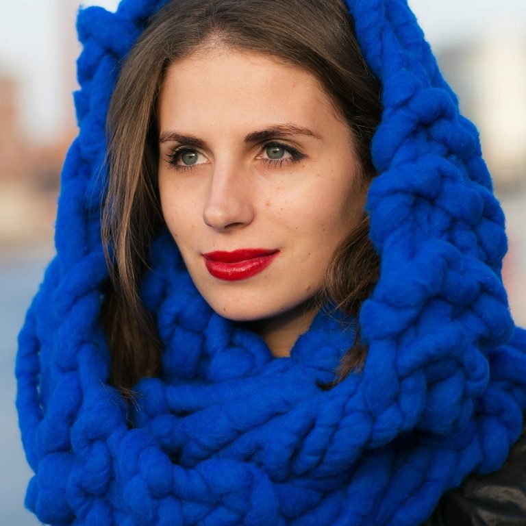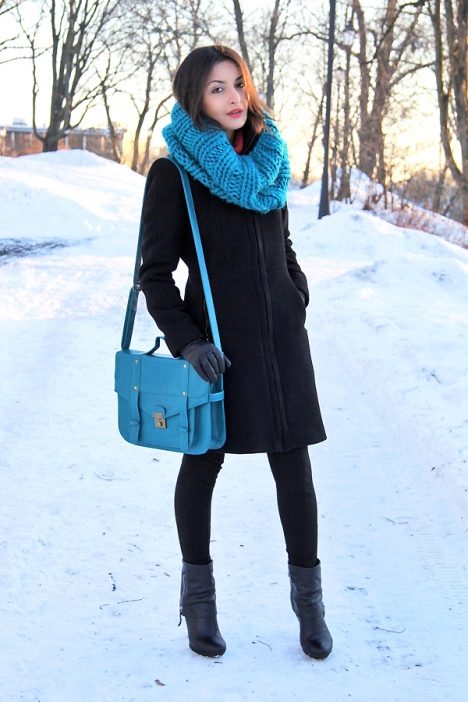 Many girls prefer blue color, because it can be considered universal. It suits brown-haired women, brunettes and blondes. Blue color harmoniously looks in tandem with black and gray. A blue hat-scarf will be a worthy decoration of a black coat or a down jacket. It can be worn even with leather jackets. Such an image will surely attract the attention of others.