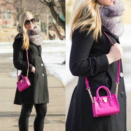 The fur scarf with a black coat of classic style looks very nice. It replaces the collar, giving the image of elegance and elegance. A bright accent of a stylish bow is a small bag of bright purple color. In this outfit you just will not go unnoticed.