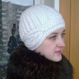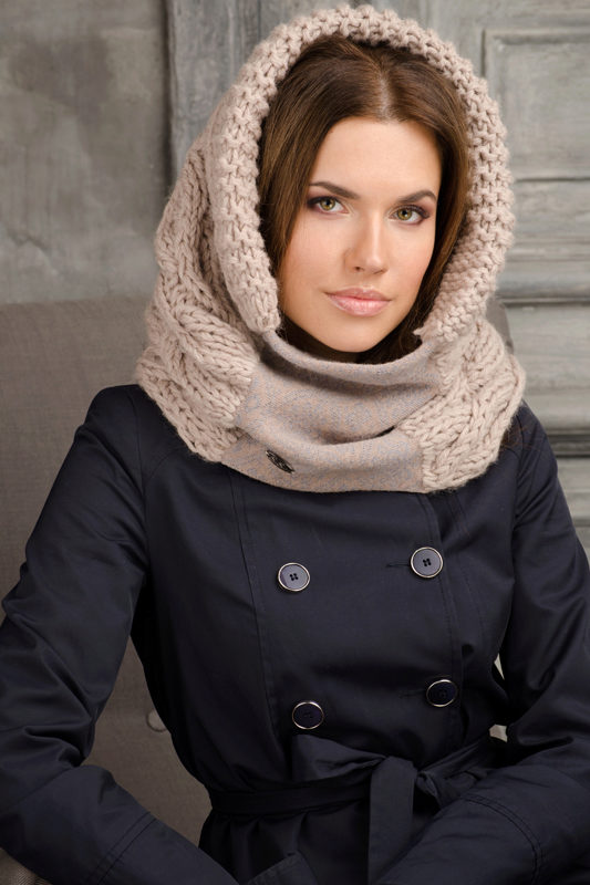 Original helmet-hat, which looks feminine and gentle.Due to the combined type of mating, such a cap looks very interesting, more reminiscent of a soft scarf or tippet tied to the head. The warm beige-peach color of the product remarkably emphasizes the color of the eyes and skin tone.